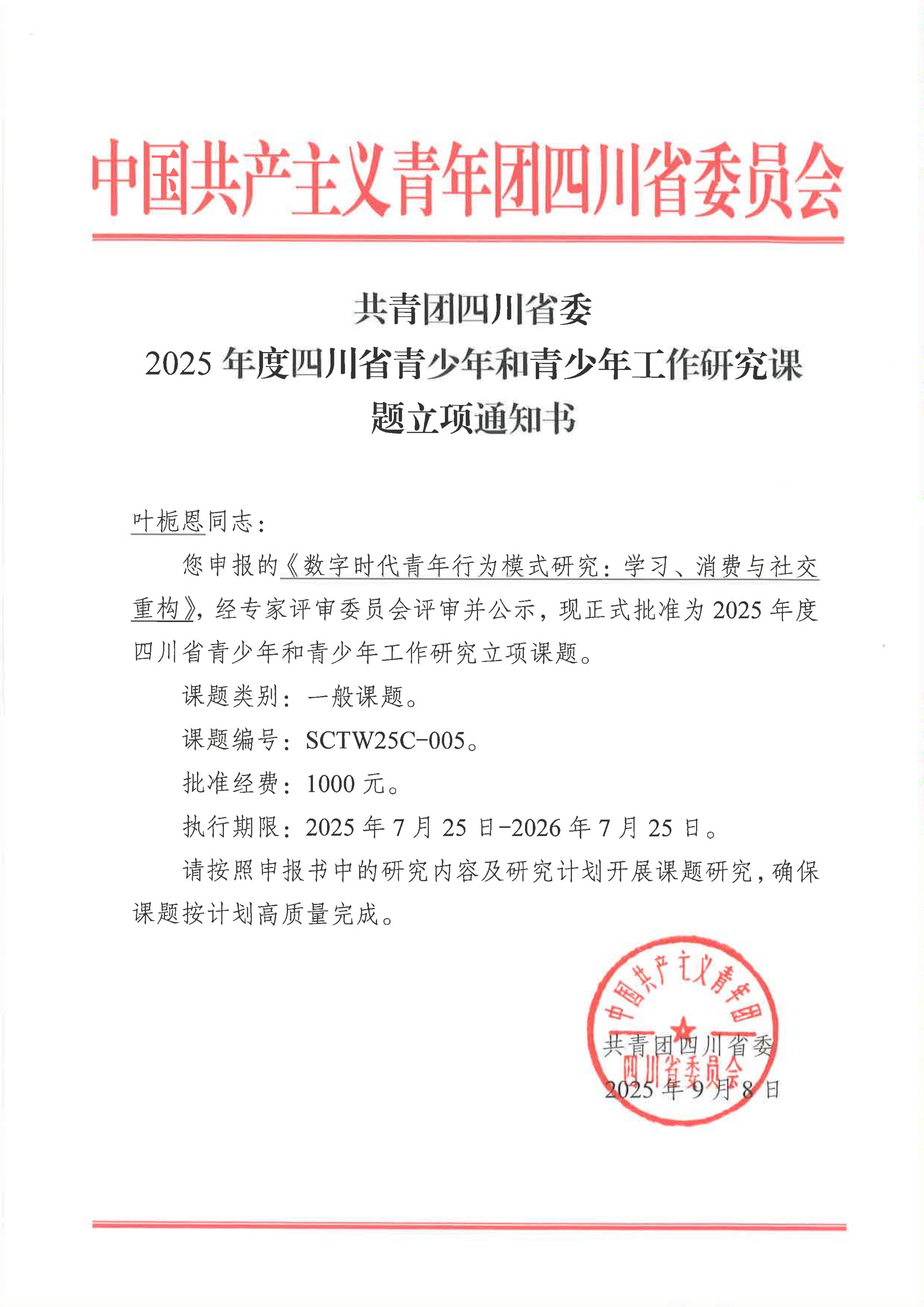 近日,从共青团四川省委获悉,我校叶栀恩老师申报的共青团四川省委2025年度四川省青少年和青少年工作研究课题《数字时代青年行为模式研究:学习、消费与社交重构》获得立项。请课题组按照共青团四川省委课题管理办法做好课题后续研究。