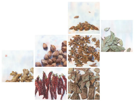 我的水彩组画创作以中华传统香料为对象,创作意图源于对民族饮食文化的深层挖掘——香料不仅是味觉的起点,更是人文精神的载体。形式上尝试打破传统绘画的边界限制,通过分割拼接的形式,将独立静物重组为具有节奏感的整体,以物象的并置与交错完成从物质表征到精神共鸣的升华。