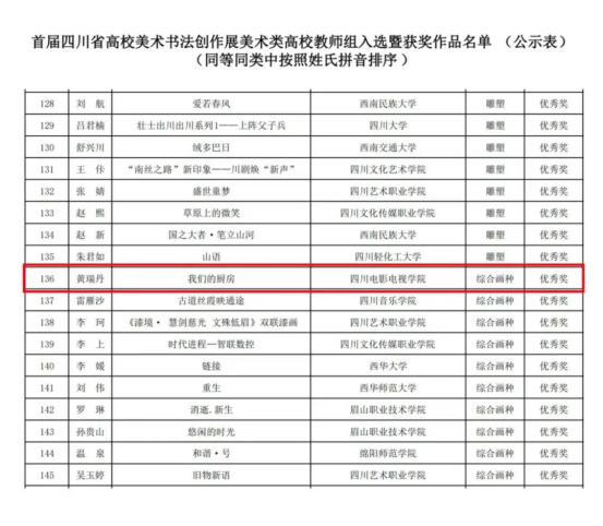 为深入贯彻党中央、国务院关于全面加强和改进新时代学校美育工作的决策部署,推动四川省高校艺术学科建设与美育事业高质量发展,提升师生艺术创作水平,由四川省教育厅、四川省文学艺术界联合会举办的首届四川省高校美术书法创作展近日圆满落幕,并公布入选暨获奖作品名单,四川电影电视学院设计与美术学院黄瑞丹老师作品入选并获“优秀奖”。