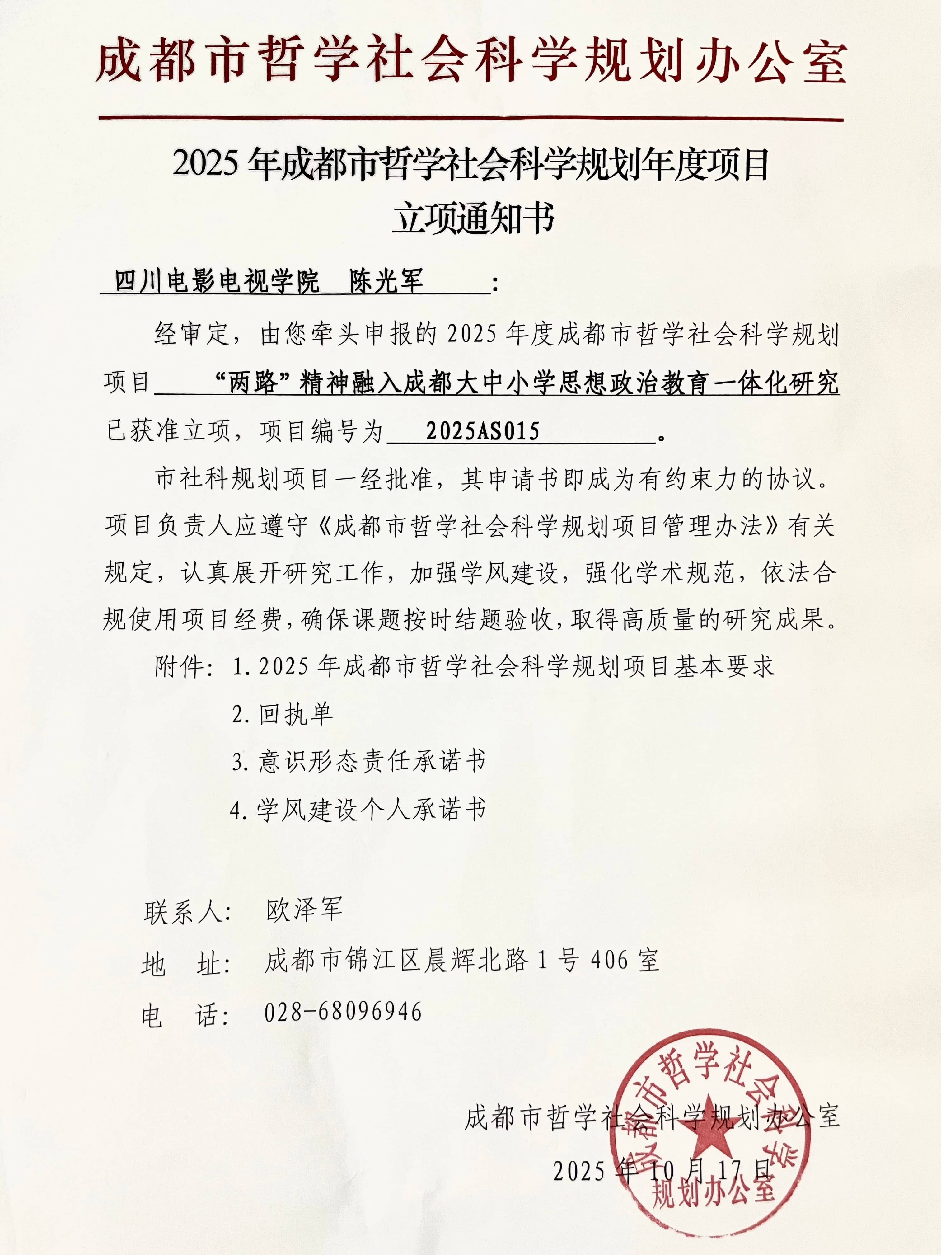 近日,从成都市哲学社会科学规划办公室获悉,我校陈光军教授主持申报的《“两路”精神融入成都大中小学思想政治教育一体化研究》获得立项,请课题组成员按照2025年成都市哲学社会科学规划年度项目管理办法做好课题后续研究。