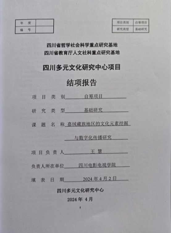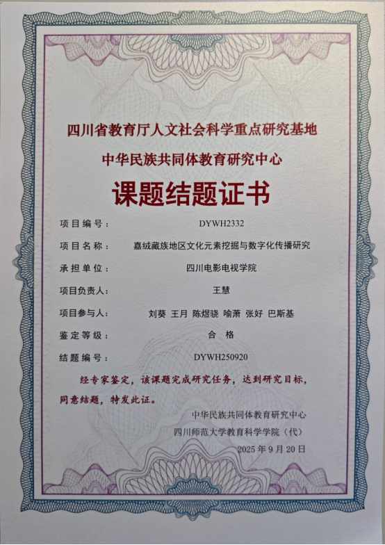 近日,从四川省教育厅人文社会科学重点研究基地中华民族共同体教育研究中心获悉,我校王慧老师主持研究的《嘉绒藏族地区文化元素挖掘与数字化传播研究》(编号:DYWH2332)经评审,正式结题。
