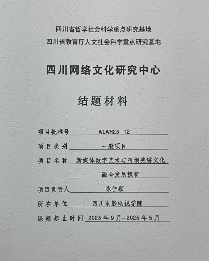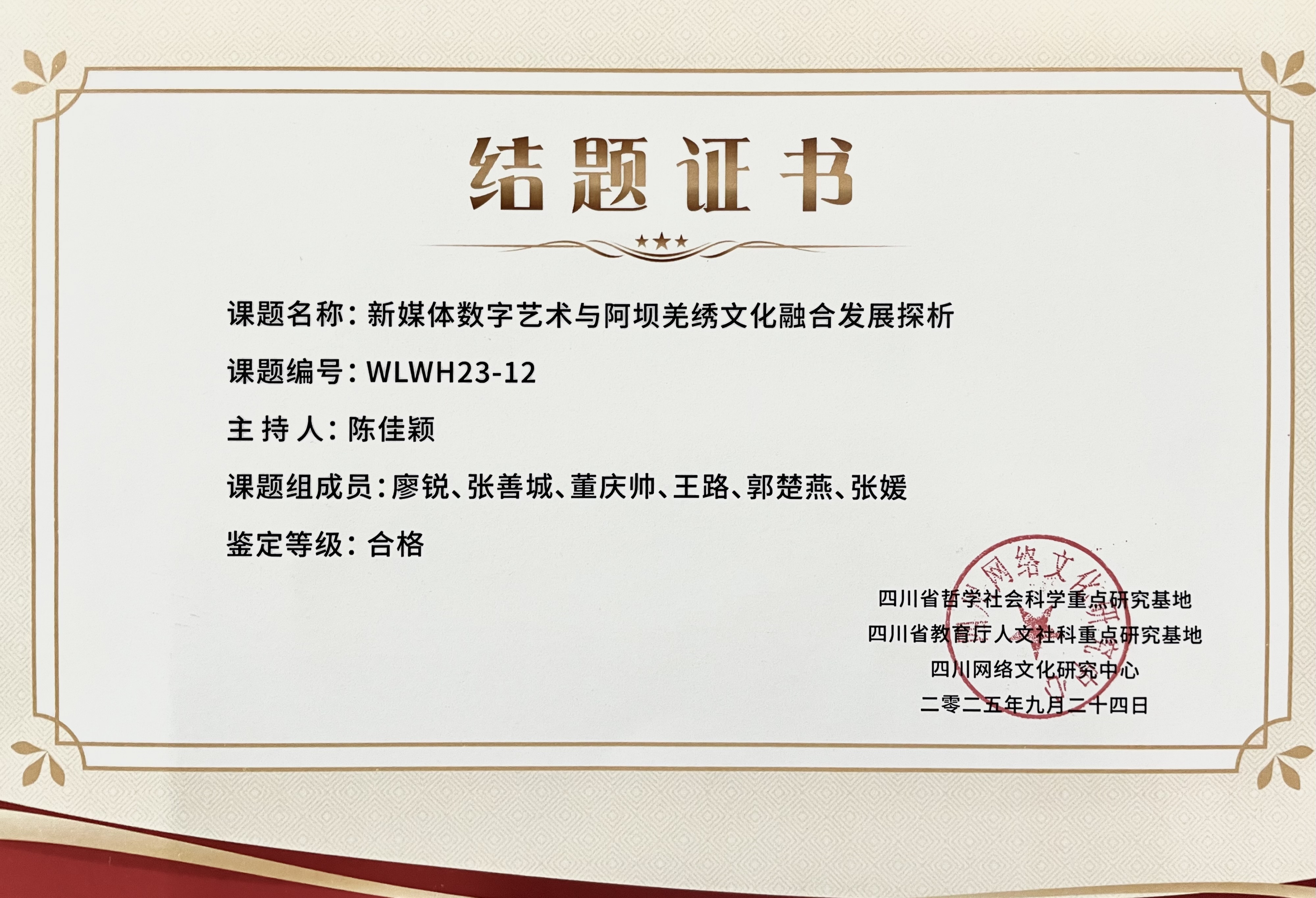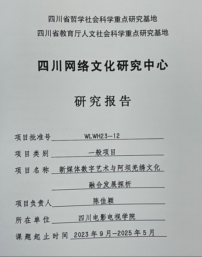 近日,从四川省哲学社会科学重点研究基地四川省教育厅人文社科重点研究基地四川网络文化研究中心获悉,我校陈佳颖老师主持研究的《新媒体数字艺术与阿坝羌绣文化融合发展探析》(项目编号:WLWH23-12)经评审正式结题。