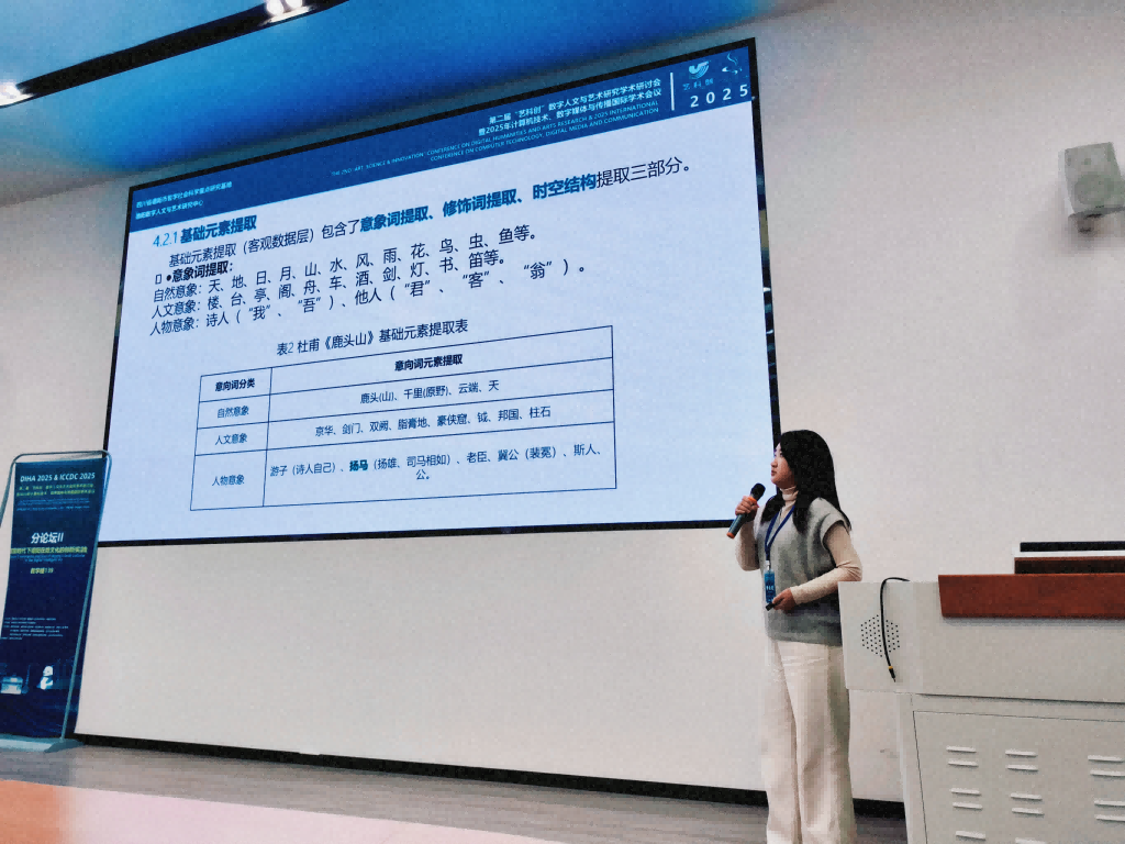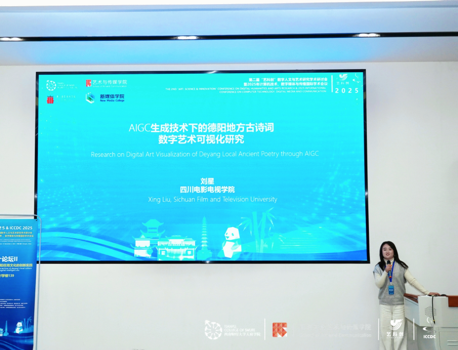 2025年11月1日,第二届“艺科创”数字人文与艺术研究学术研讨会暨2025年计算机技术、数字媒体与传播国际学术会议,在西南财经大学天府学院成都校区东区顺利召开。本次会议由西南财经大学天府学院、德阳数字人文与艺术研究中心、成都师范学院联合主办,西南财经大学天府学院艺术与传媒学院承办,并得到德阳市社科联、四川师范大学等十余所高校及机构协办,成都市公共艺术学会指导。会议汇聚了国内外数字人文与艺术研究领域的专家学者,共同探讨数字技术与人文艺术的融合发展。本次会议征文经资格初审、专家匿名评审、中心委员会终审三个环节,最终确定获奖论文40篇,其中我校新媒体学院刘星、朱琴老师撰写的学术论文《AIGC生成技术下的德阳地方古诗词数字艺术可视化研究》,作为德阳哲学社会科学重点研究基地德阳数字人文与艺术研究中心2025年度课题项目研究阶段性成果,成功入选并被获得三等学术论文奖。论文《Research on Digital Art Visualization of Deyang Local Ancient Poetry through AIGC》被会议录用,将在Conference Proceeding上发表,并提交至EI, Scopus, Google scholar。