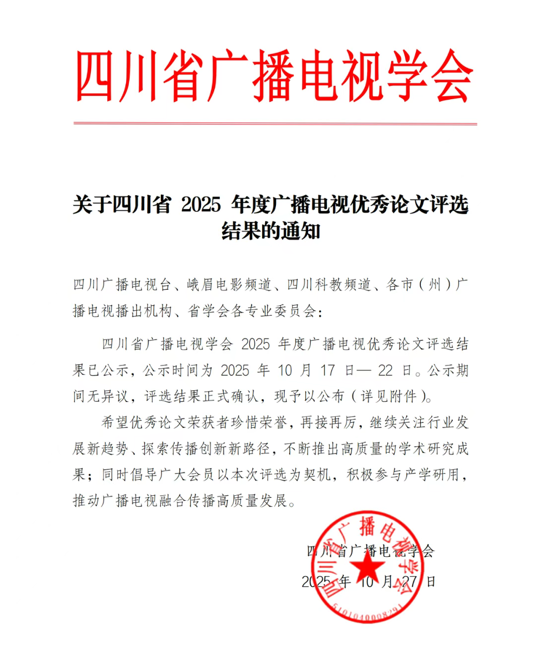 近日,从四川省广播电视学会获悉,我校苏丹老师撰写发表的论文《调和与重构:新时代国产影视剧中警察形象塑造研究》获得一等作品;吴迪老师撰写发表的论文《“锦绣天府·安逸四川”——四川文旅宣传的美学符号构建与“大视听”传播实践探析》获得二等作品;蒋峰老师撰写发表的论文《新时代家庭伦理剧的道德叙事建构》获得二等作品;代宜纳老师撰写发表的论文《杨荔钠“春”三部曲中“水”意象叙事下的女性表达》获得三等作品;任云芳老师撰写发表的论文《从地域文化与传播视角看川渝方言在影视视听文化中的影响》获得三等作品。