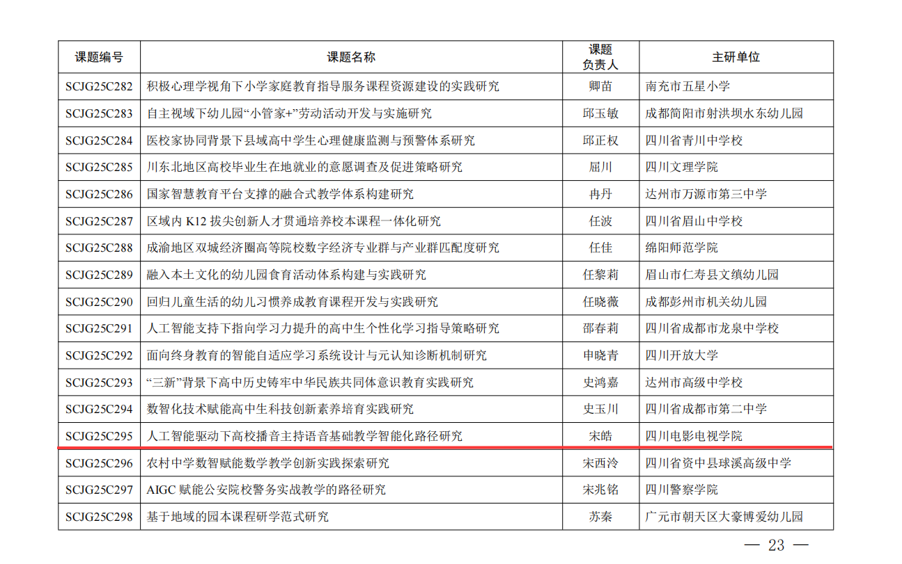 近日,从四川省教育科学规划领导小组办公室获悉,我校播音主持学院宋皓副教授主持申报的《人工智能驱动下高校播音主持语音基础教学智能化路径研究》获得立项,请课题组成员按照四川省教育科学规划课题管理办法做好课题后续研究。该课题是继我校蒲爱民教授主持立项的2024年度四川省教育科学规划课题《数字赋能教育教学创新实践研究》(项目编号:SCJG24C110)后我校又一次获得该项目的立项。