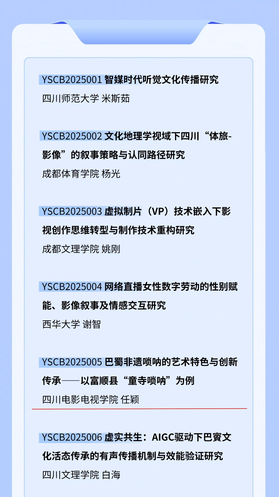 近日,从四川省艺术传播学会获悉,我校舞蹈学院任颖老师主持申报的《巴蜀非遗唢呐的艺术特色与创新传承——以富顺县“童寺唢呐”为例》(项目编号:YSCB2025005)获得立项,请课题组成员按照四川省艺术传播学会课题管理办法做好课题后续研究。