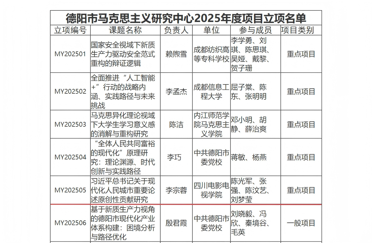近日,从德阳市马克思主义研究中心获悉,我校马克思主义学院李宗蓉老师主持申报的《习近平总书记关于现代化人民城市重要论述原创性贡献研究》获得立项,请课题组成员按照德阳市马克思主义研究中心课题管理办法做好课题后续研究。