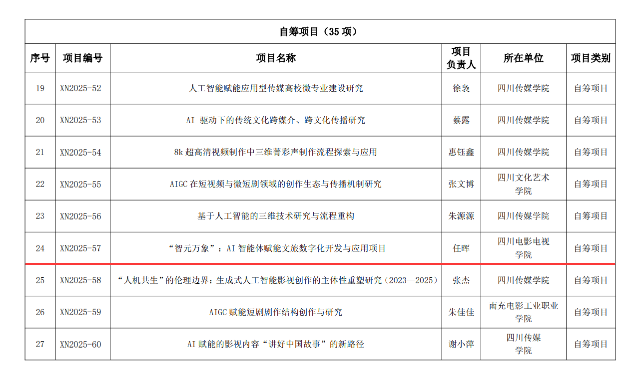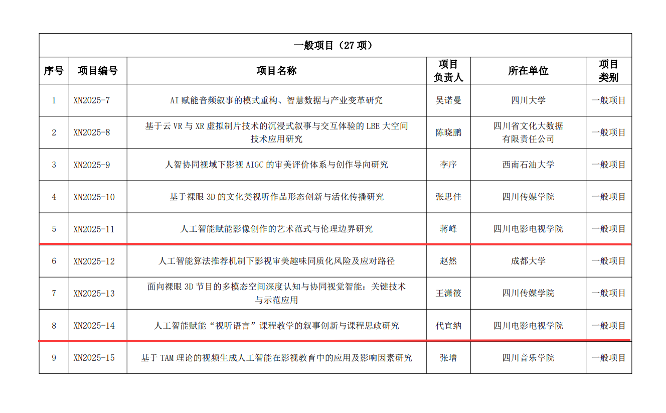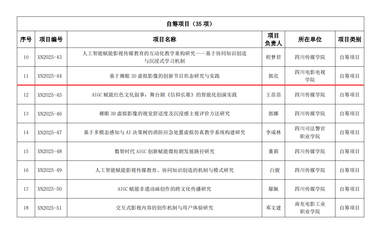 近日,从虚拟现实视听国家广电总局实验室获悉,我校视听传媒学院院长助理蒋峰副教授、视听传媒学院代宜纳老师、新媒体学院李叶老师、教学实验中心郭亮老师、新媒体学院任晖老师分别主持申报的《人工智能赋能影像创作的艺术范式与伦理边界研究》《人工智能赋能“视听语言”课程教学的叙事创新与课程思政研究》《AIGC赋能的沉浸式交互微短剧智能生成技术集成与“一带一路”跨文化传播应用研究》《基于裸眼3D虚拟影像的创新节目形态研究与实践》《“智元万象”:AI智能体赋能文旅数字化开发与应用项目》获得立项,请课题组成员按照虚拟现实视听国家广电总局实验室项目管理办法做好课题后续研究。