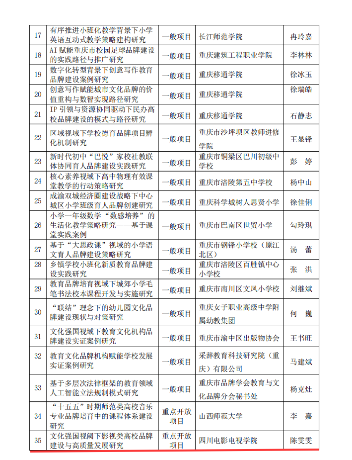 近日,从重庆市品牌学会获悉,我校电影学院陈雯雯老师主持申报的《文化强国视阈下影视类高校品牌建设与高质量发展研究》获得重点开放项目立项,请课题组成员按照2025年度重庆市品牌学会教育与文化品牌研究项目管理办法做好课题后续研究。