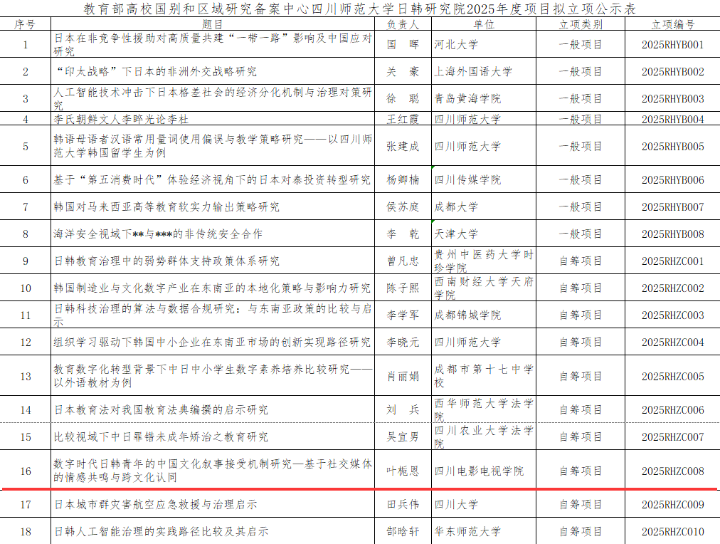 我校叶栀恩老师主持申报的教育部高校国别和区域研究备案中心四川师范大学日韩研究院2025年度项目获得立项