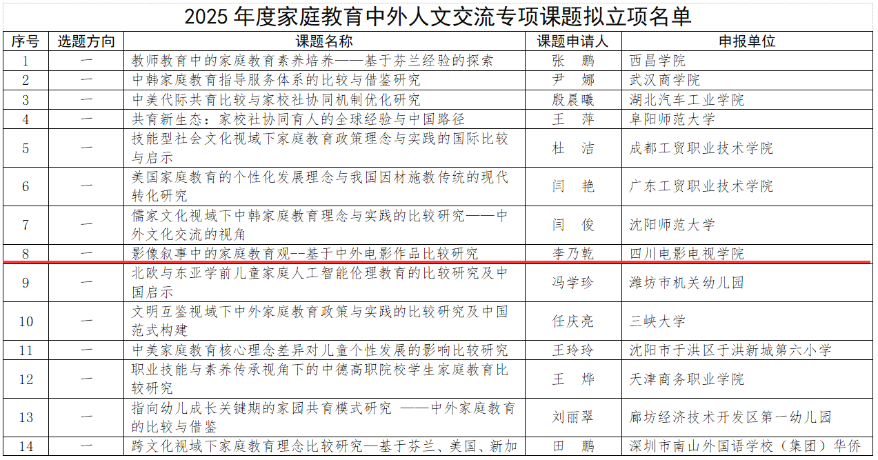 近日,从教育部中外人文交流中心与家庭教育中外人文交流研究院获悉,我校管理学院李乃乾老师主持申报的《影像叙事中的家庭教育观--基于中外电影作品比较研究》获得立项,请课题组成员按照教育部中外人文交流中心与家庭教育中外人文交流研究院课题管理办法做好课题后续研究。