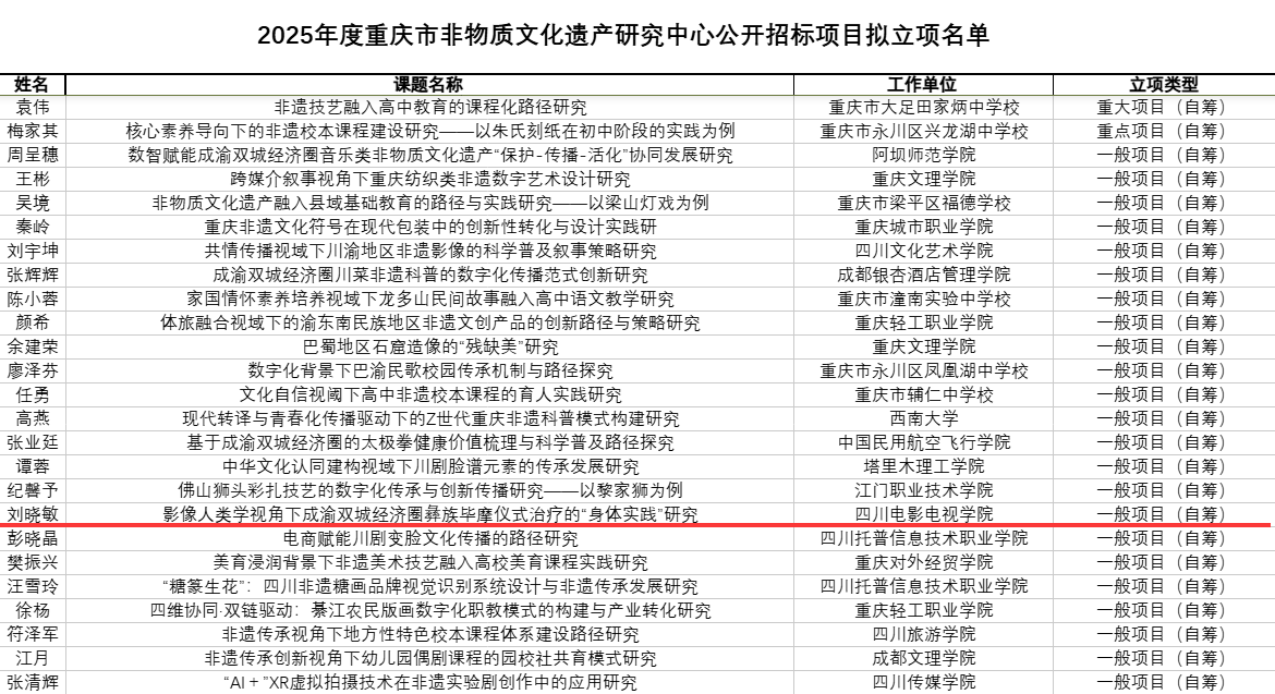 近日,从重庆市非物质文化遗产研究中心获悉,我校视听传媒学院刘晓敏老师主持申报的《影像人类学视角下成渝双城经济圈彝族毕摩仪式治疗的“身体实践”研究》获得立项,请课题组成员按照重庆市非物质文化遗产研究中心课题管理办法做好课题后续研究。