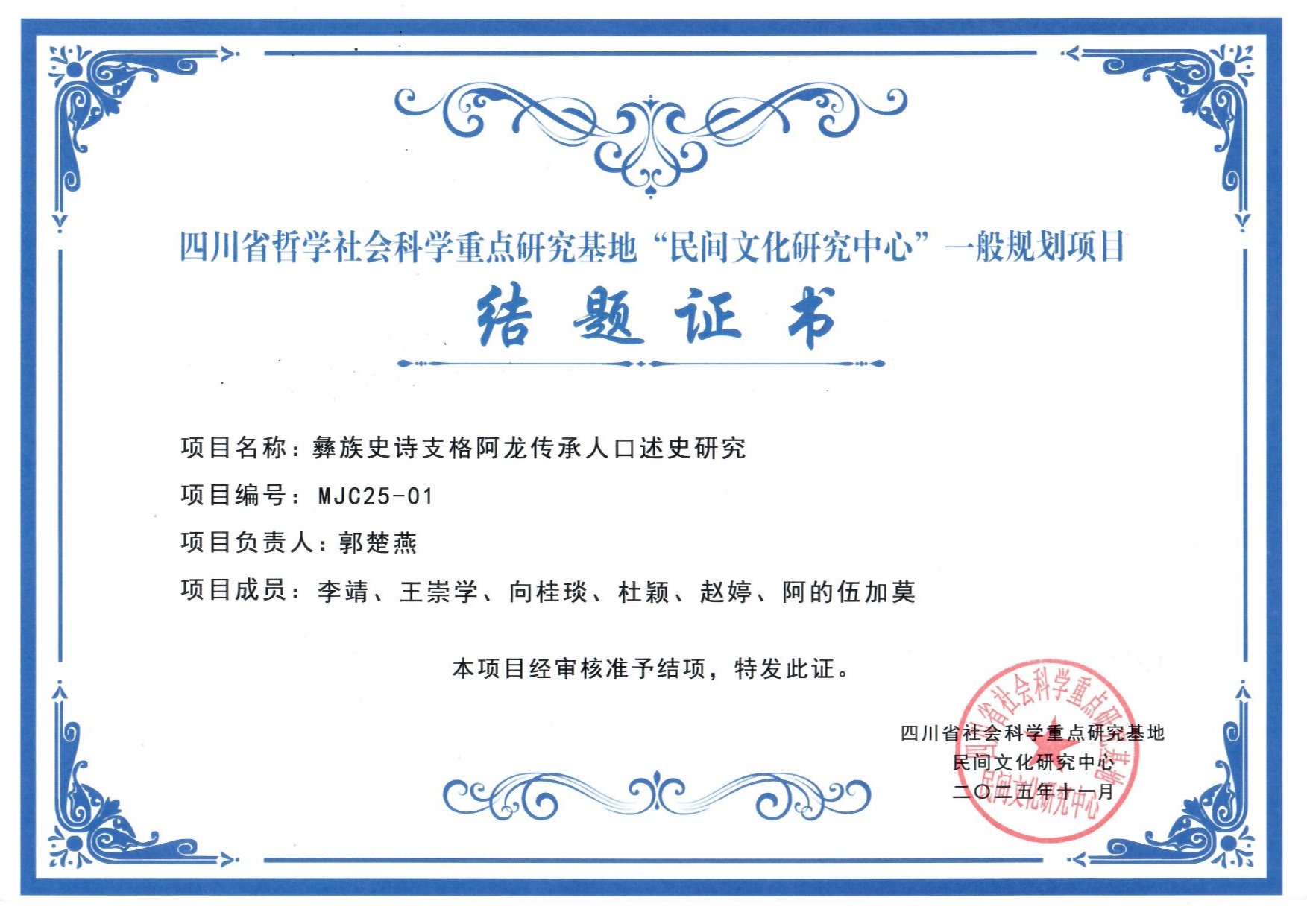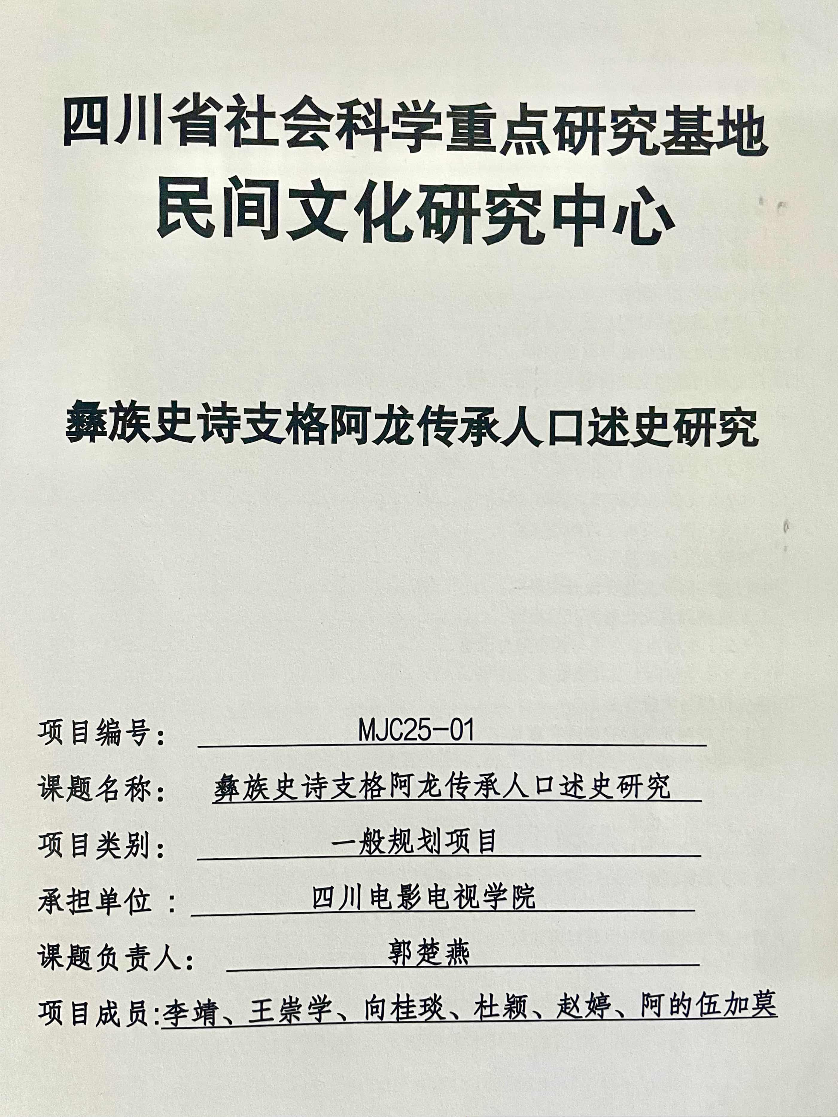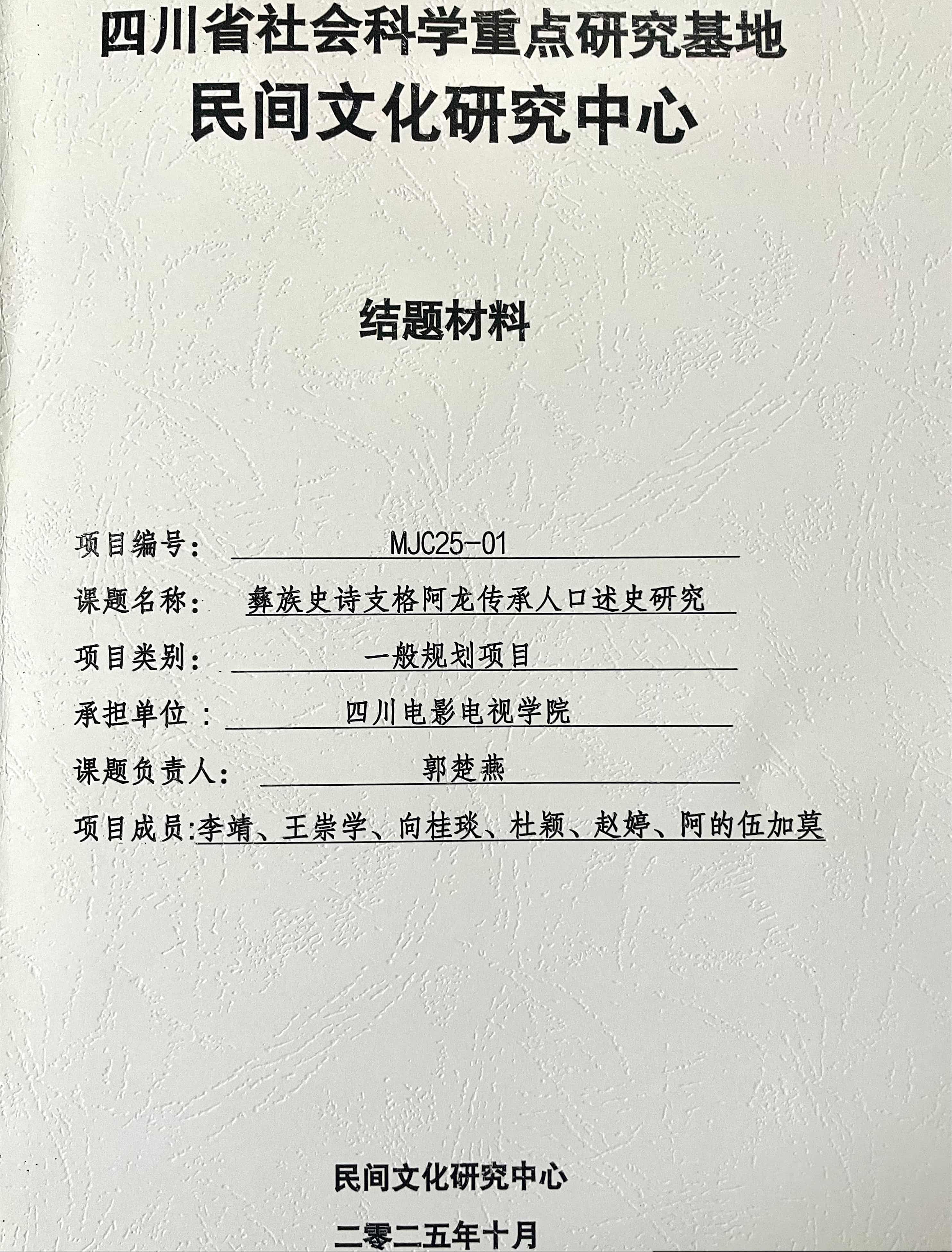 近日,从民间文化研究中心获悉,我校设计与美术学院郭楚燕老师主持研究的《彝族史诗支格阿龙传承人口述史研究》(项目编号:MJC25-01),经评审正式结题。