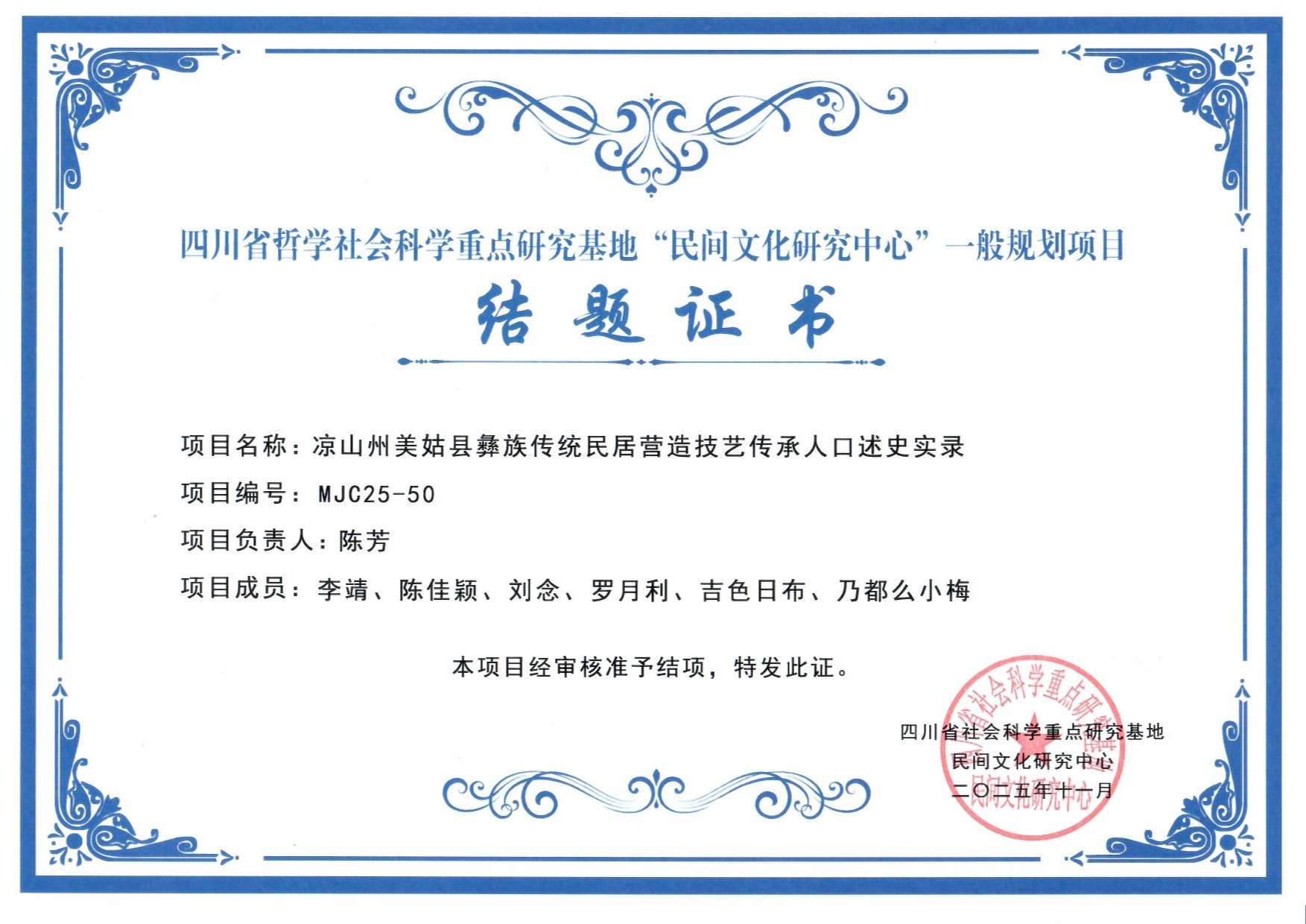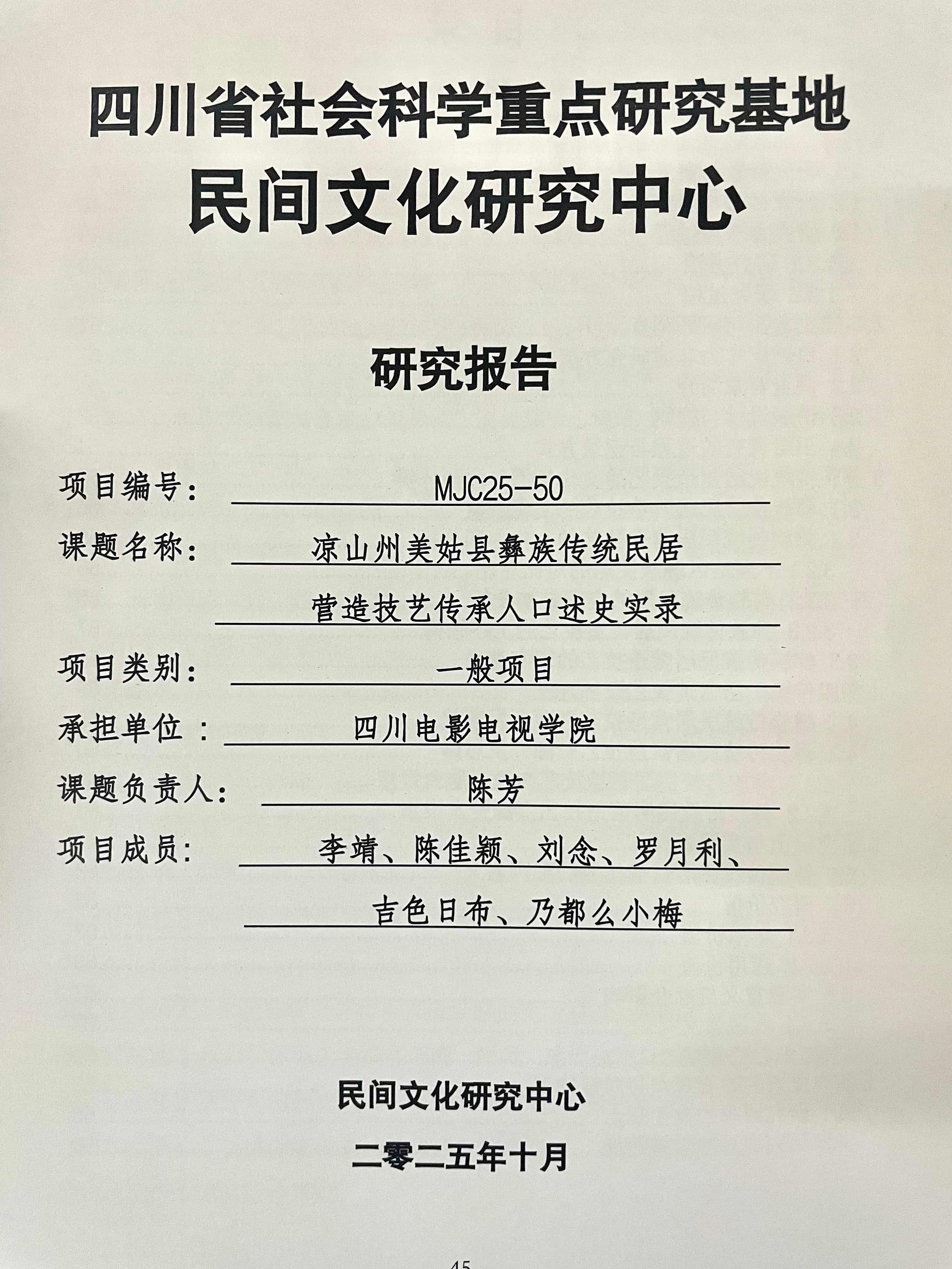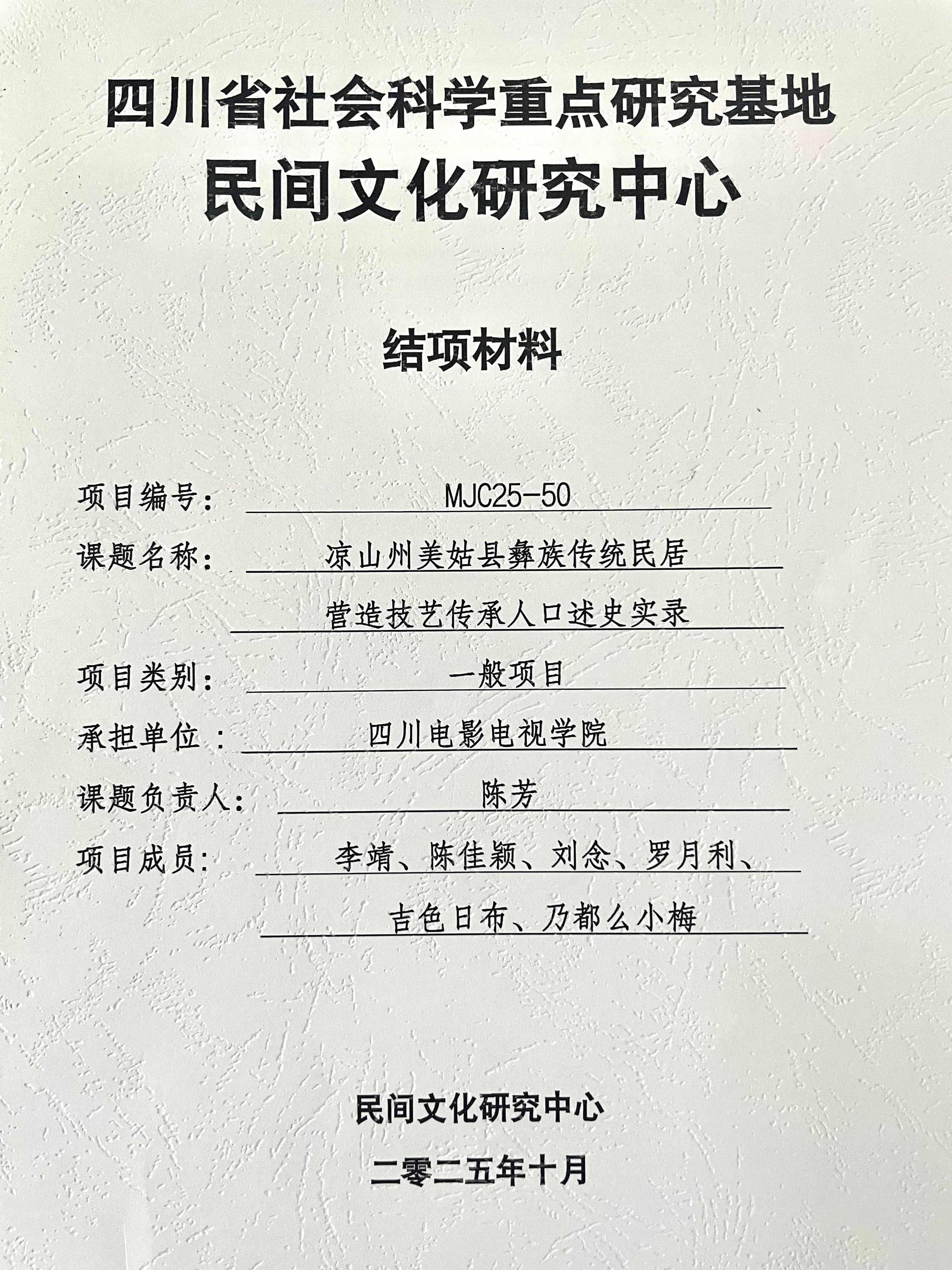 近日,从民间文化研究中心获悉,我校设计与美术学院陈芳老师主持研究的《凉山州美姑县彝族传统民居营造技艺传承人口述史实录》(项目编号:MJC25-50),经评审正式结题。