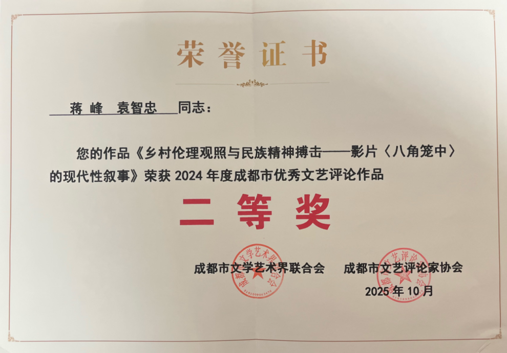 近日获悉,我校电视学院院长助理蒋峰副教授发表的学术论文《乡村伦理观照与民族精神搏击--影片〈八角笼中>的现代性叙事》,获成都市文学艺术界联合会、成都市文艺评论家协会共同主办的 2024 年度成都市优秀文艺评论作品二等奖。