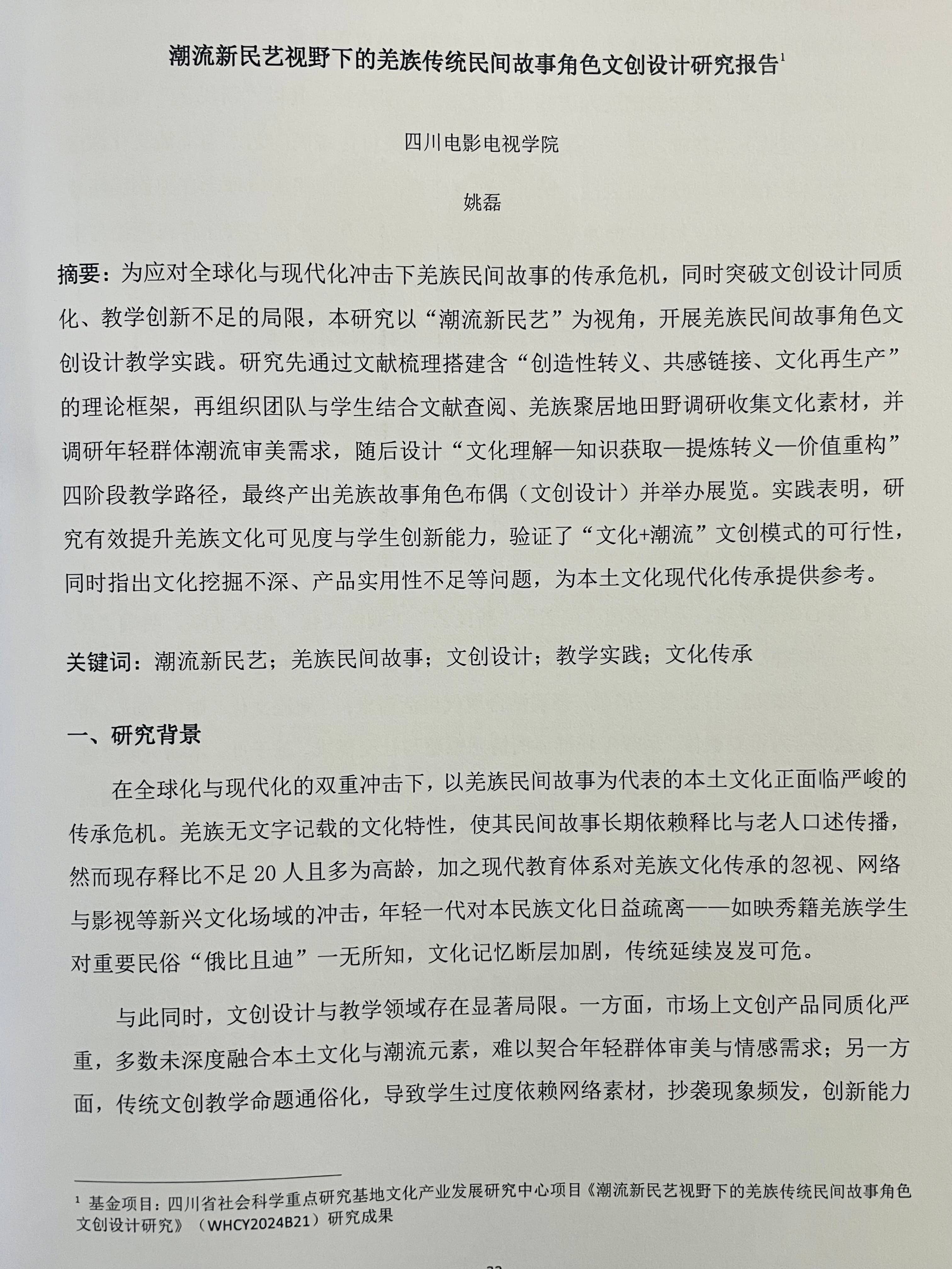 1.《潮流新民艺视野下的羌族传统民间故事角色文创设计研究》研究报告;