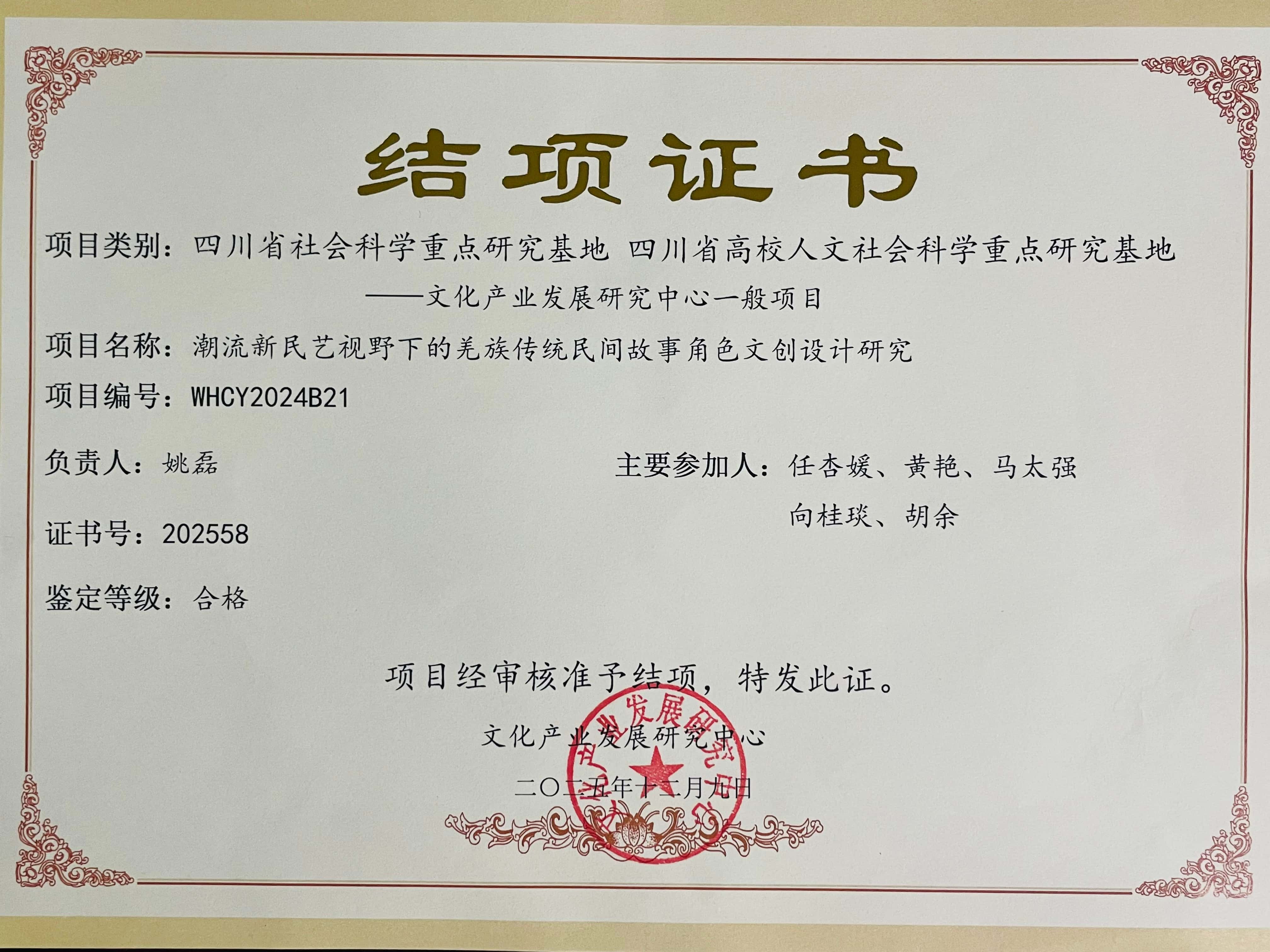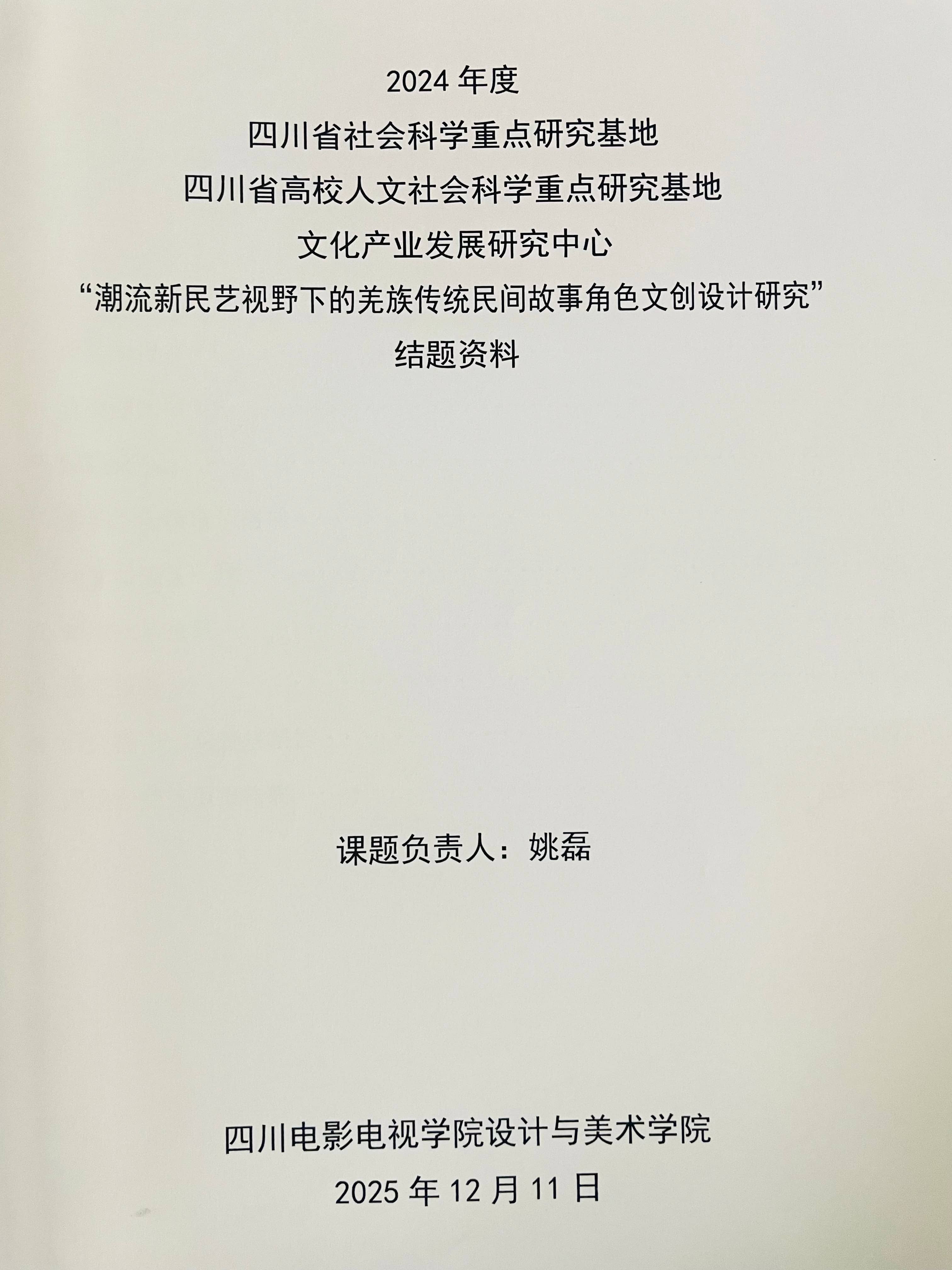 近日,从文化产业发展研究中心获悉,我校设计与美术学院姚磊老师主持研究的《潮流新民艺视野下的羌族传统民间故事角色文创设计研究》,经评审正式结题。