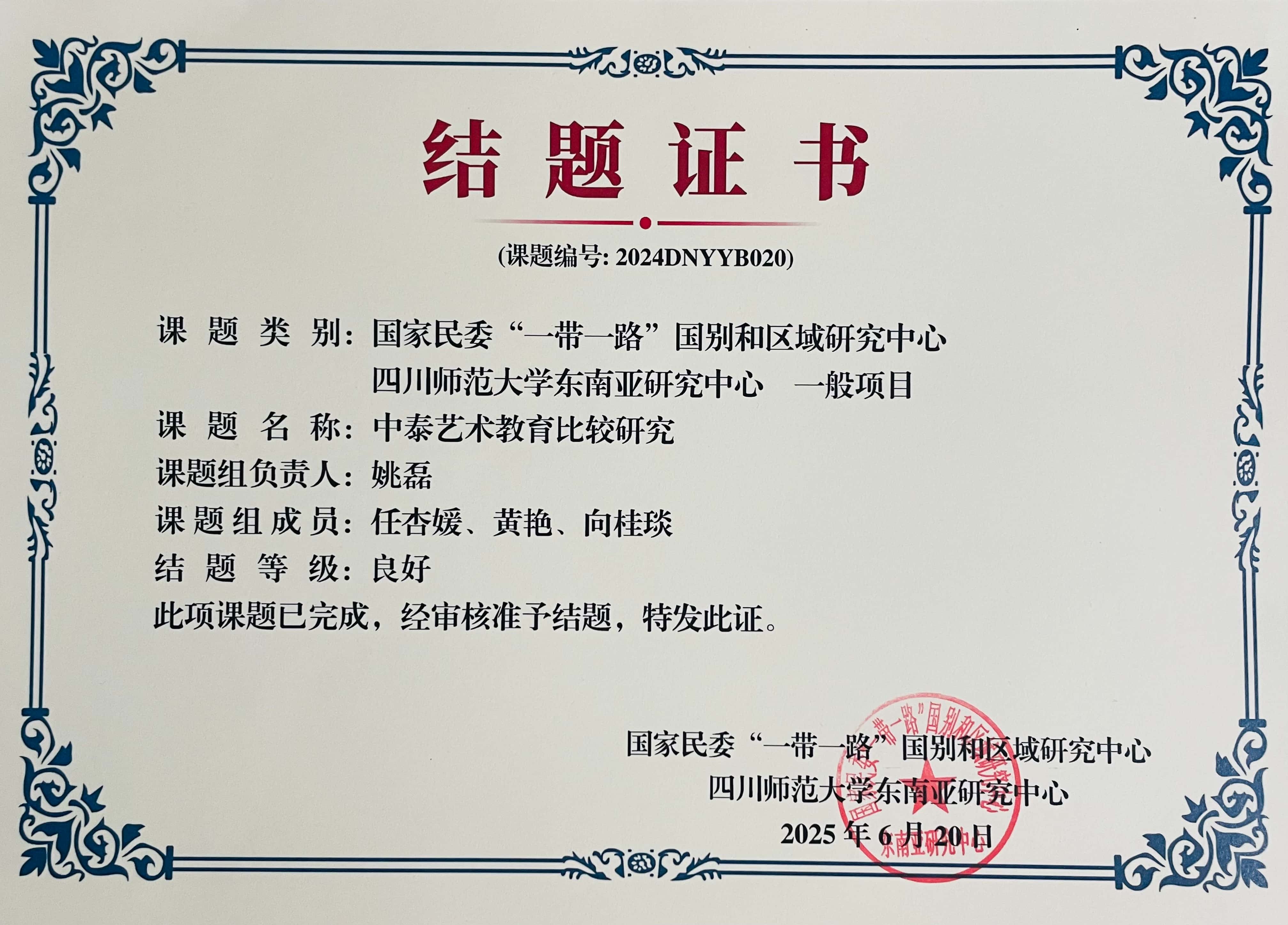 近日,从四川师范大学东南亚研究中心获悉,我校设计与美术学院姚磊老师主持研究的《中泰艺术教育比较研究》,经评审正式结题。