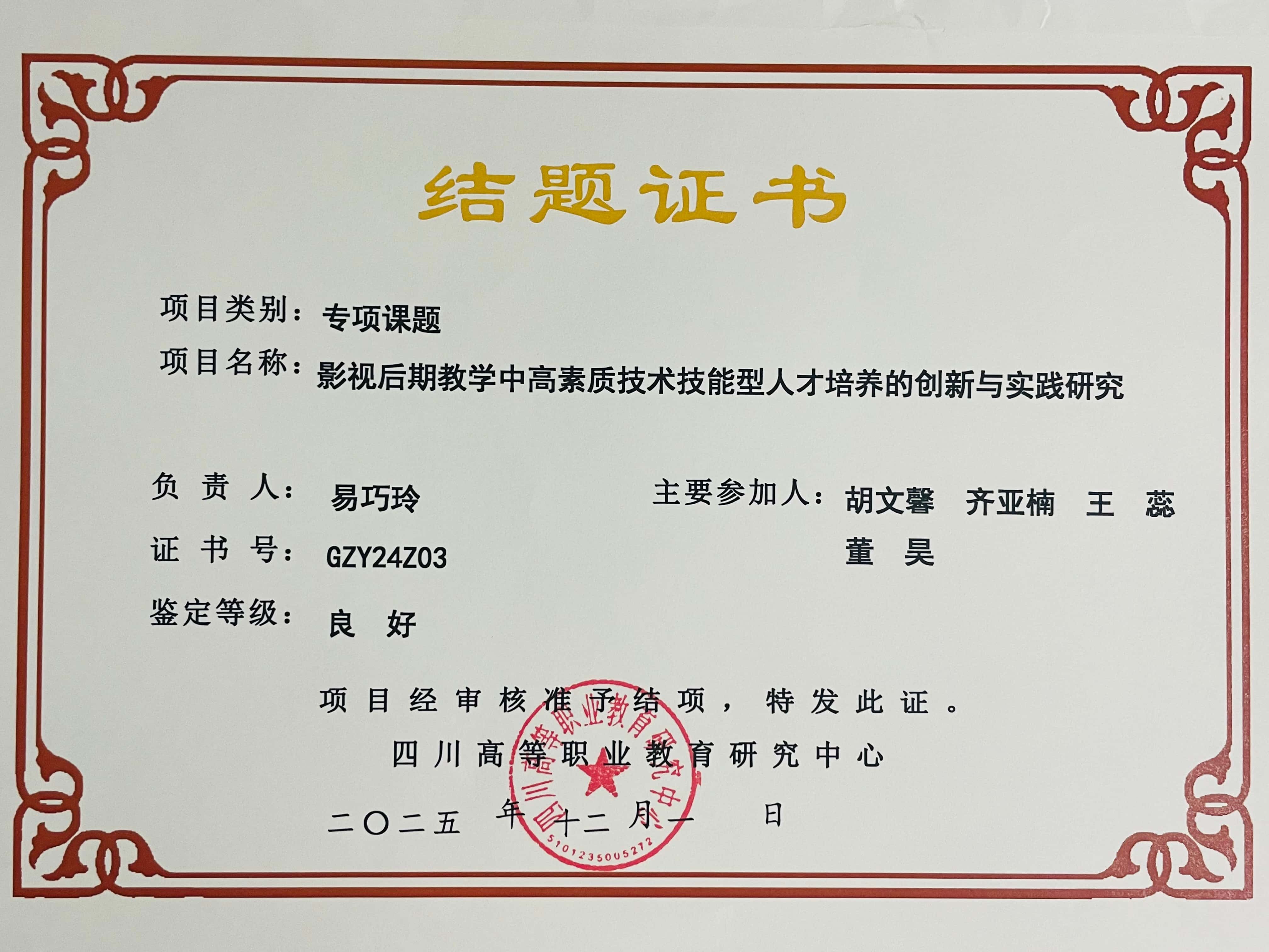 近日,从四川高等职业教育研究中心获悉,我校视听传媒学院易巧玲老师主持研究的《影视后期教学中高素质技术技能型人才培养的创新与实践研究》,经评审正式结题。