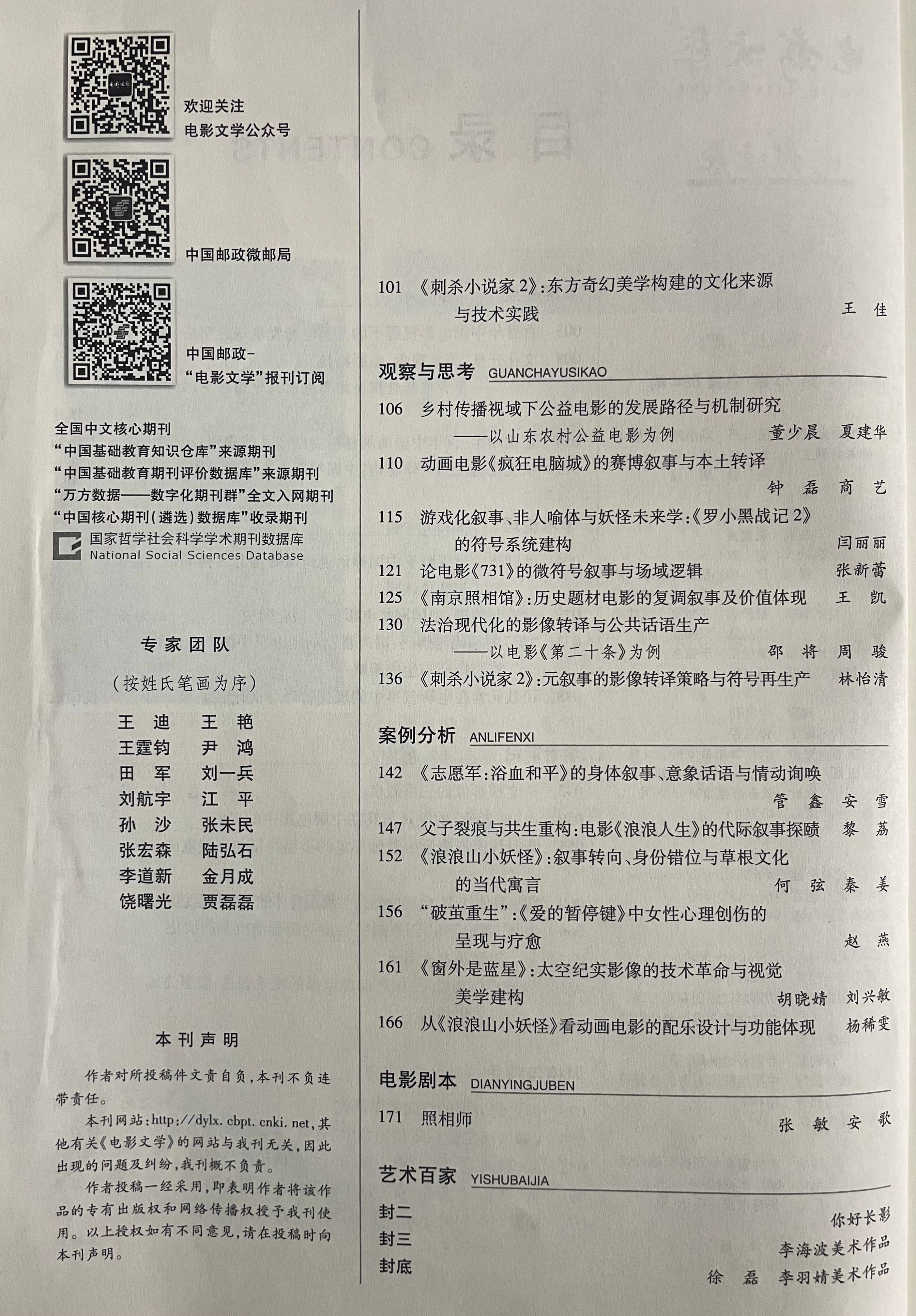 当《电影文学》创刊于1958年,其宗旨是立足电影电视的理论研究,关注导演表演的创作思潮,拓展学术争鸣的文化视野,探究艺术流派的价值取向。其栏目设有:学术论坛、博士论坛、新锐视点、导演评述、动漫研究、高校方桌、热片劲评、风格与特色、作品透视、环球纵横、文本研究、影视传播、艺术学苑、影视翻译、影视教育、新电影史料、电影剧本等栏目。