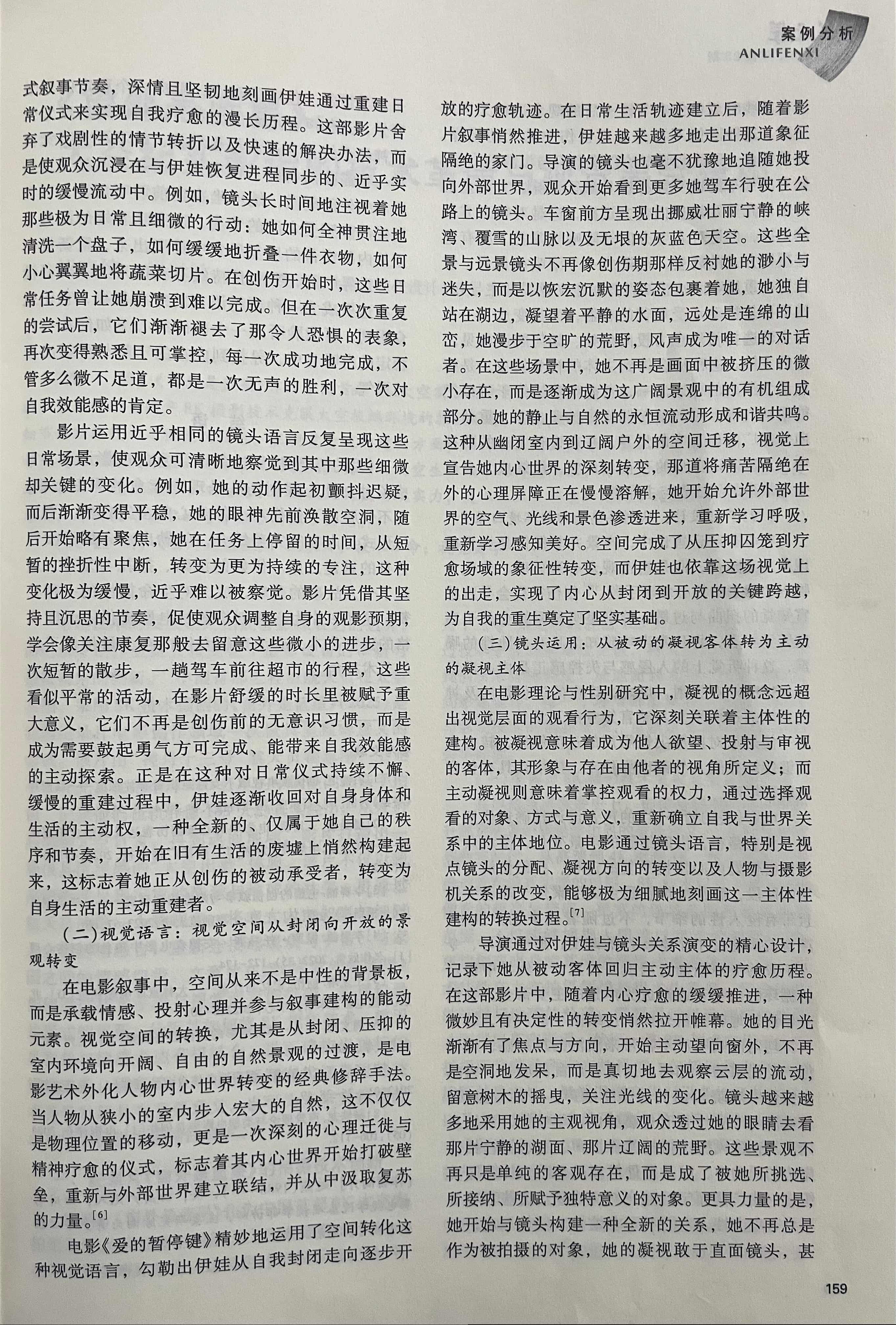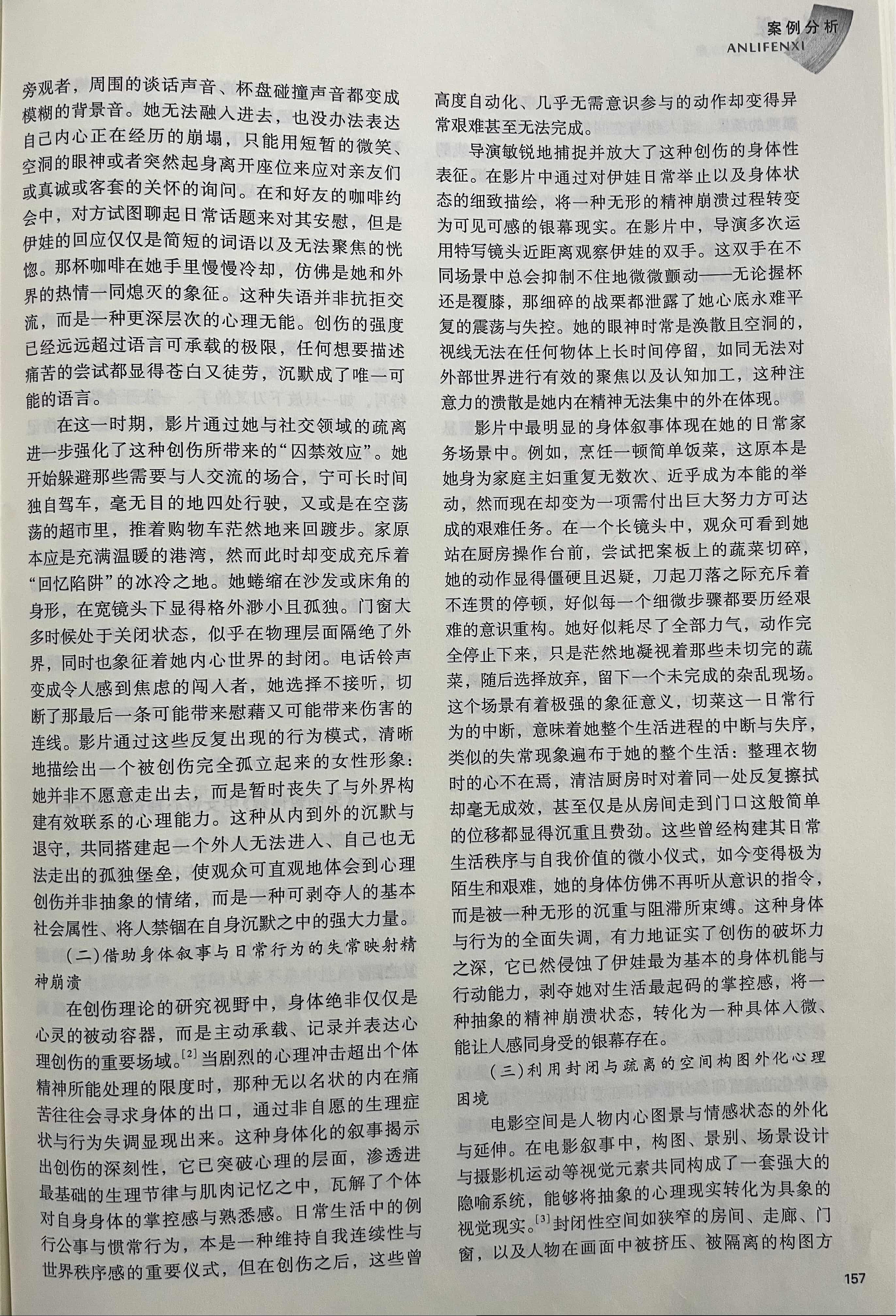 该文提出:《爱的暂停键》以中年女性伊娃在婚姻破裂后的心理崩溃与重建为主线,通过“失语”与社交隔离、身体行为的失常、封闭空间的隐喻以及感官记忆的闪回,深刻呈现了女性心理创伤的复杂样态。影片进一步借助缓慢的叙事节奏、视觉空间从封闭向开放的转变、凝视主体性的回归以及声音设计从刺耳鸣响到环境白噪音的过波,构建出一套内在而渐进的疗愈叙事。最终,伊娃通过日常仪式的重建与自我凝视的复归,完成了从创伤承受者到生命主导者的蜕变,体现了女性心理修复的独特路径与力量。