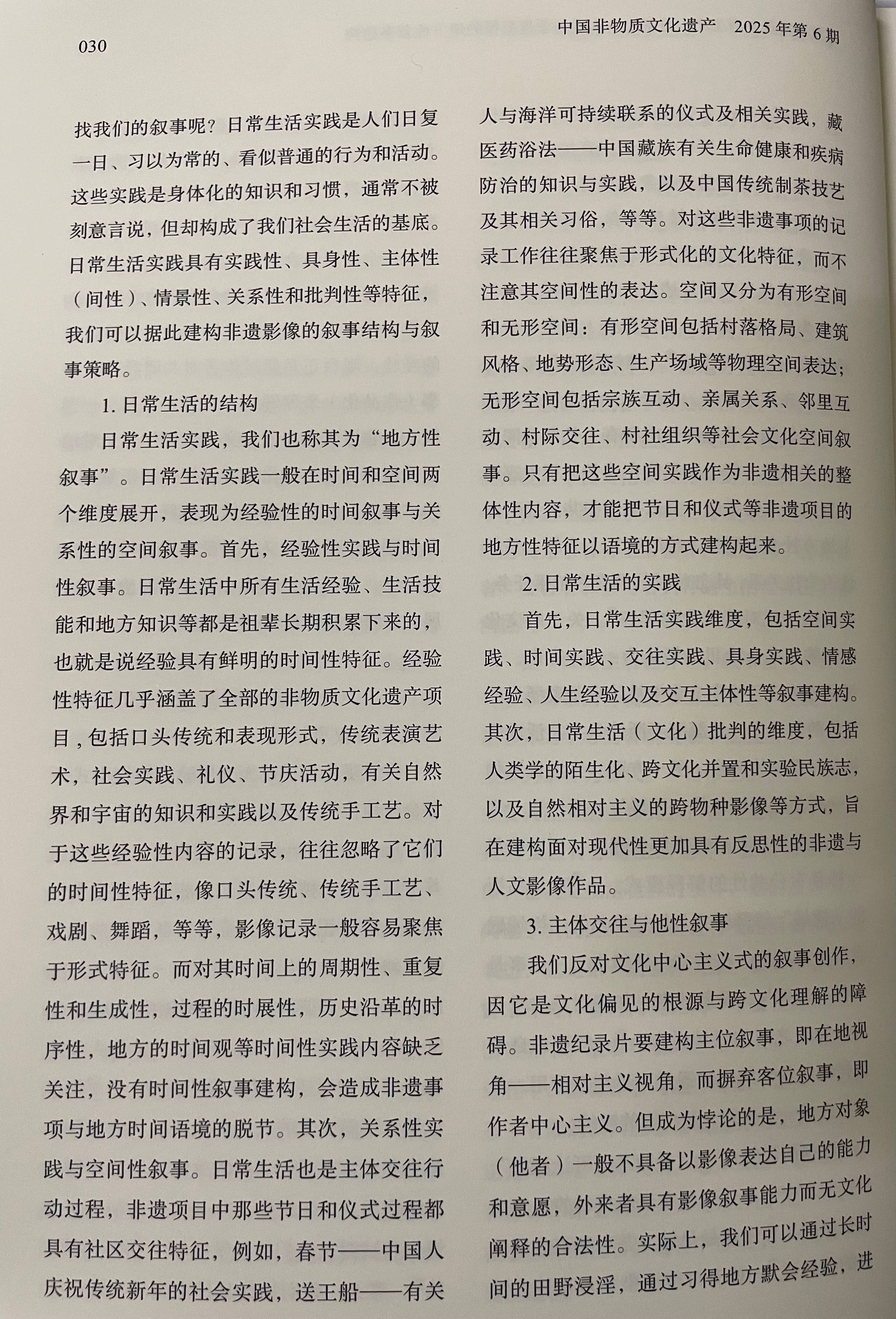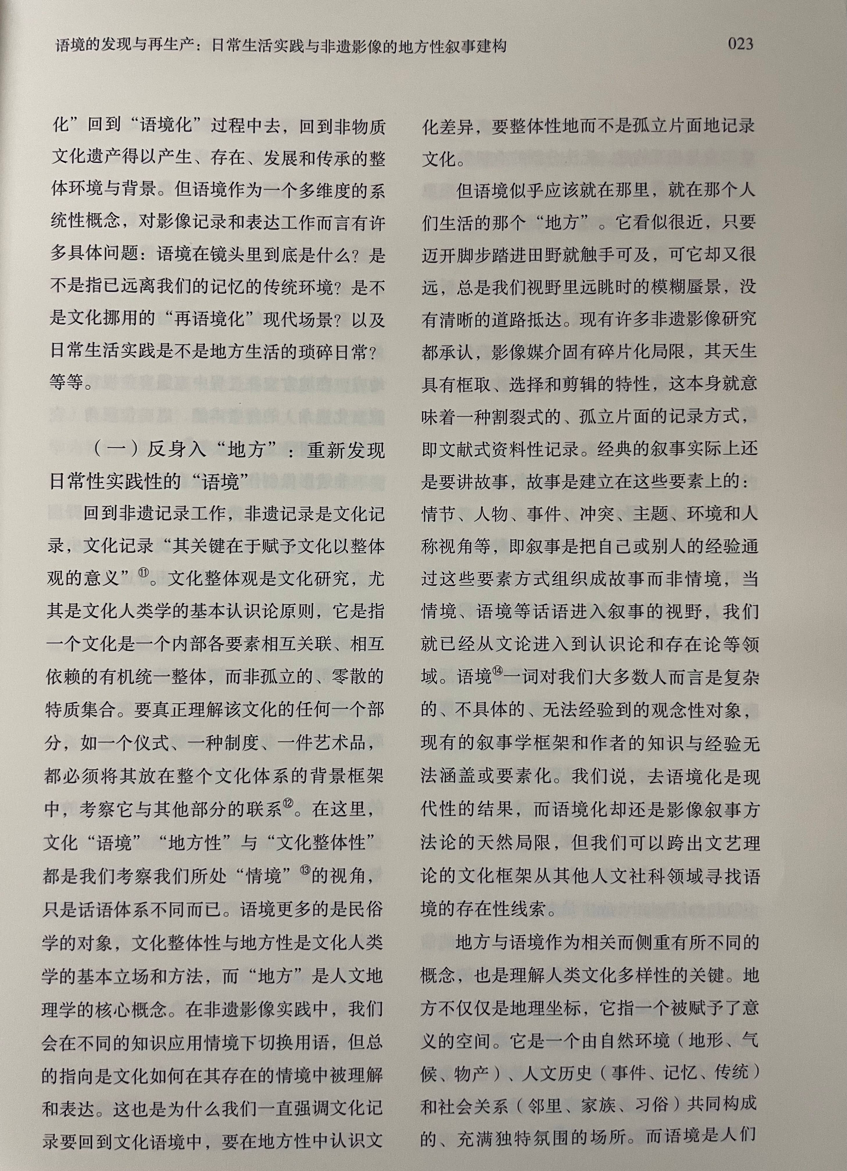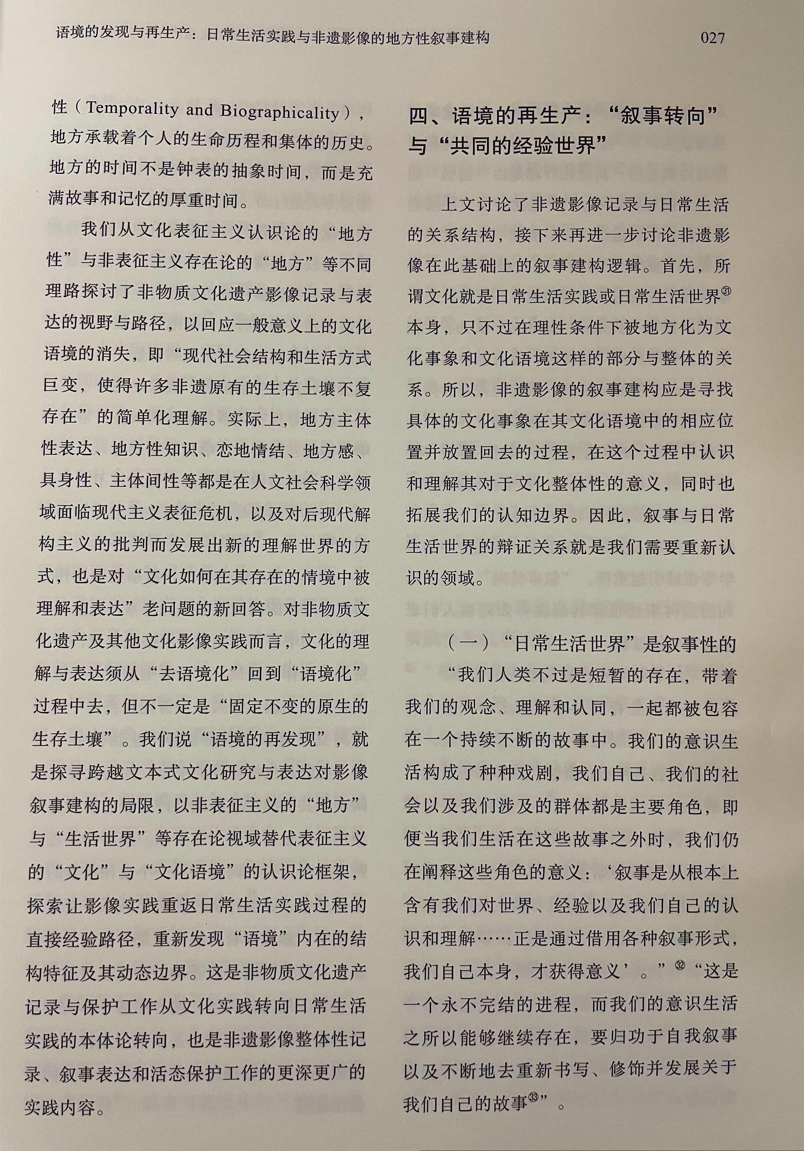 文章提出:影像方法是非物质文化遗产记录与保护工作重要的方法与形式,但现有的非遗影像实践多停留在对非遗项目的本体性特征的记录,而对非遗事项进行整体性的影像记录表达则面临较大的困难,表现为影像难以将非遗放归于持有者的社会文化生活过程中进行叙事。非物质文化遗产被视为传统习俗在现代社会中的文化角色转换,而当“文化”成为影像表达的对象,就必然受到文化理论与文艺理论两种知识理性力量的支配。现当代文化研究主流的表征主义的文化阐释范式,以及现代主义的文艺理论与审美现代性对日常生活的批判,都深刻影响着非遗影像的记录观念与表现形式,实际造成影像作品中的非遗事象从持有者的文化传统与社会生活中“脱嵌”,影像难以建构语境化、情境化的地方性叙事。非遗影像应在本体论的“日常生活实践”视域中重新发现非遗的实在的叙事语境,即以“非表征论”跨过“文化框架”的理性中介,以直接经验路径来实现非物质文化遗产的整体性叙事。