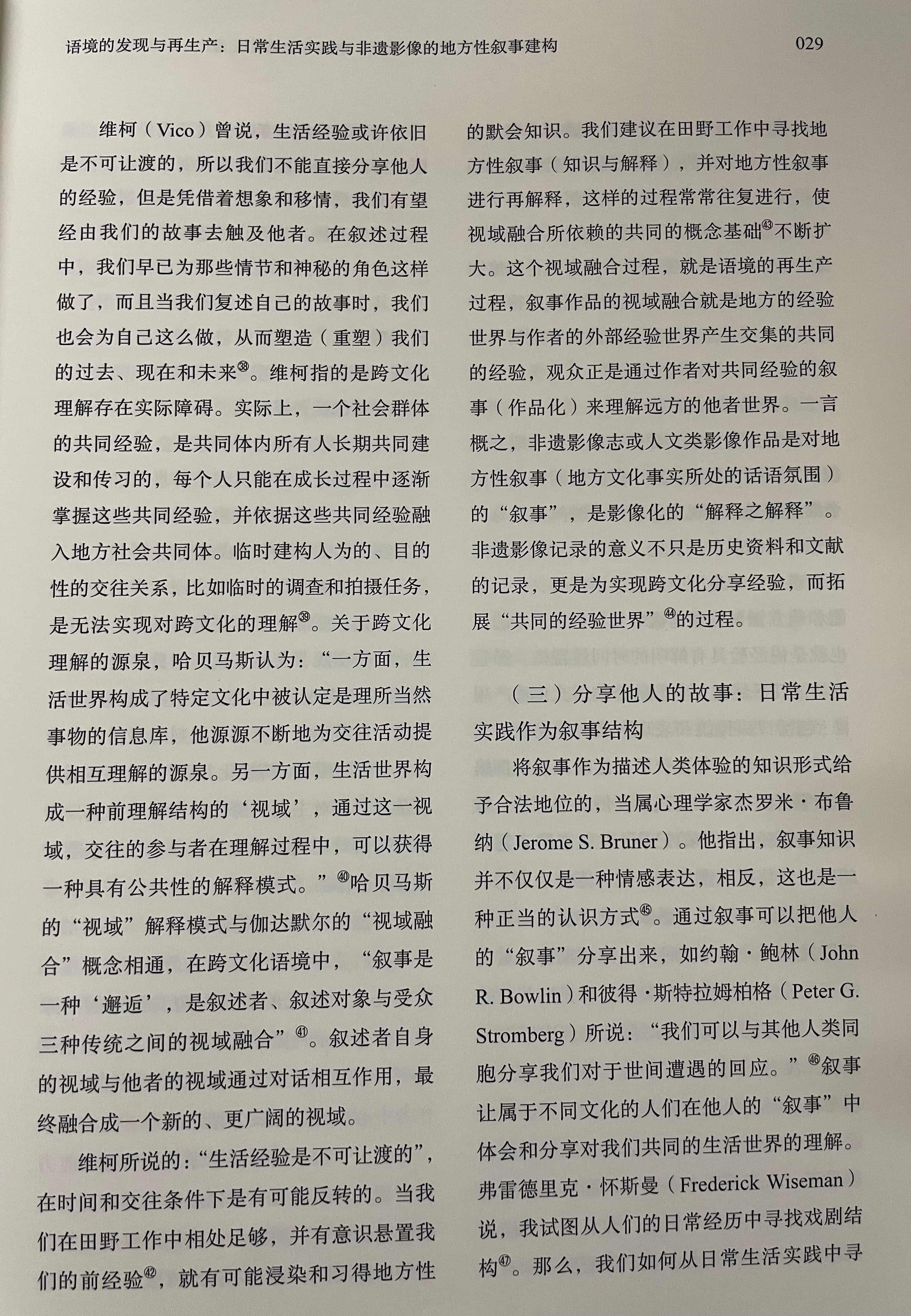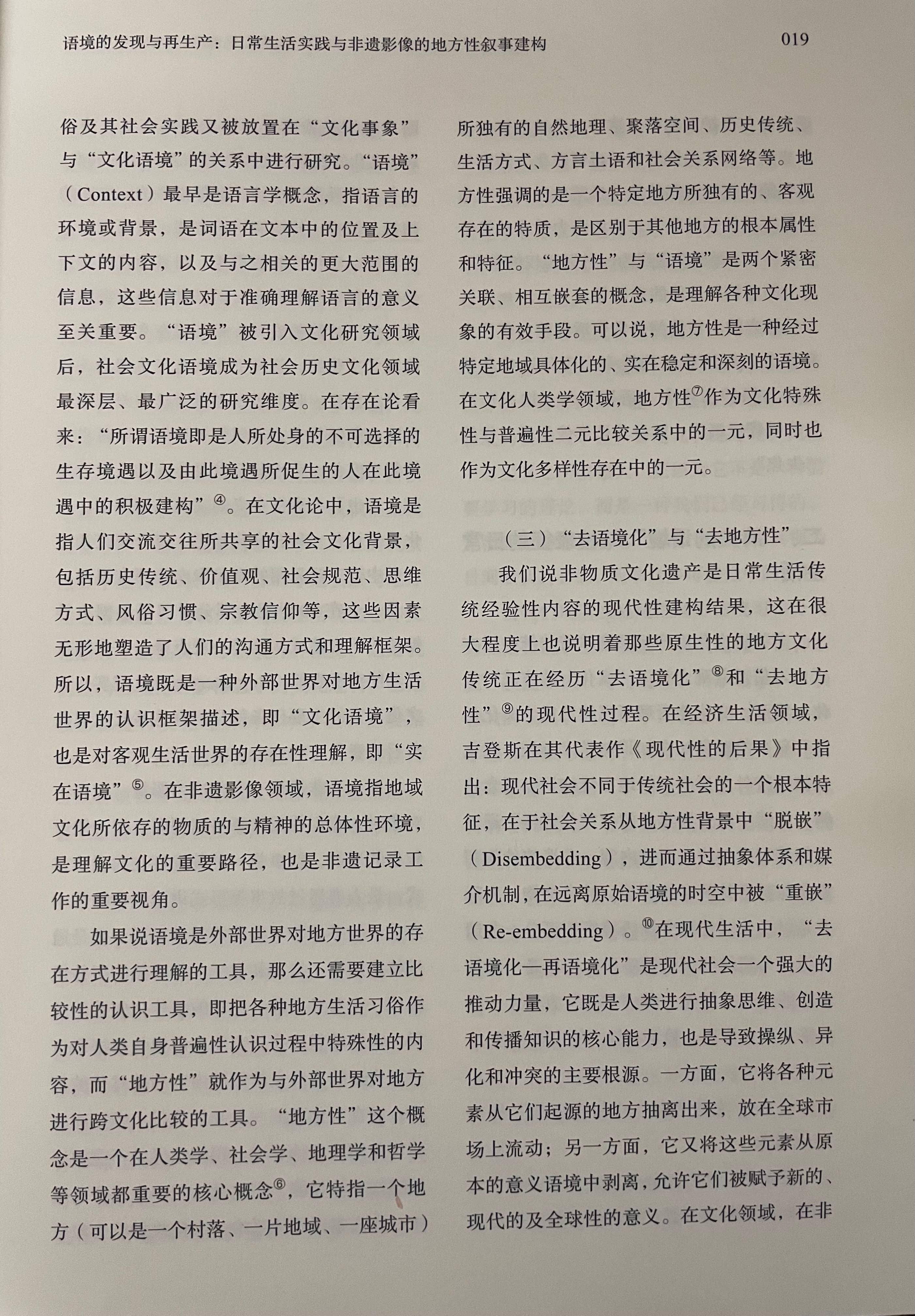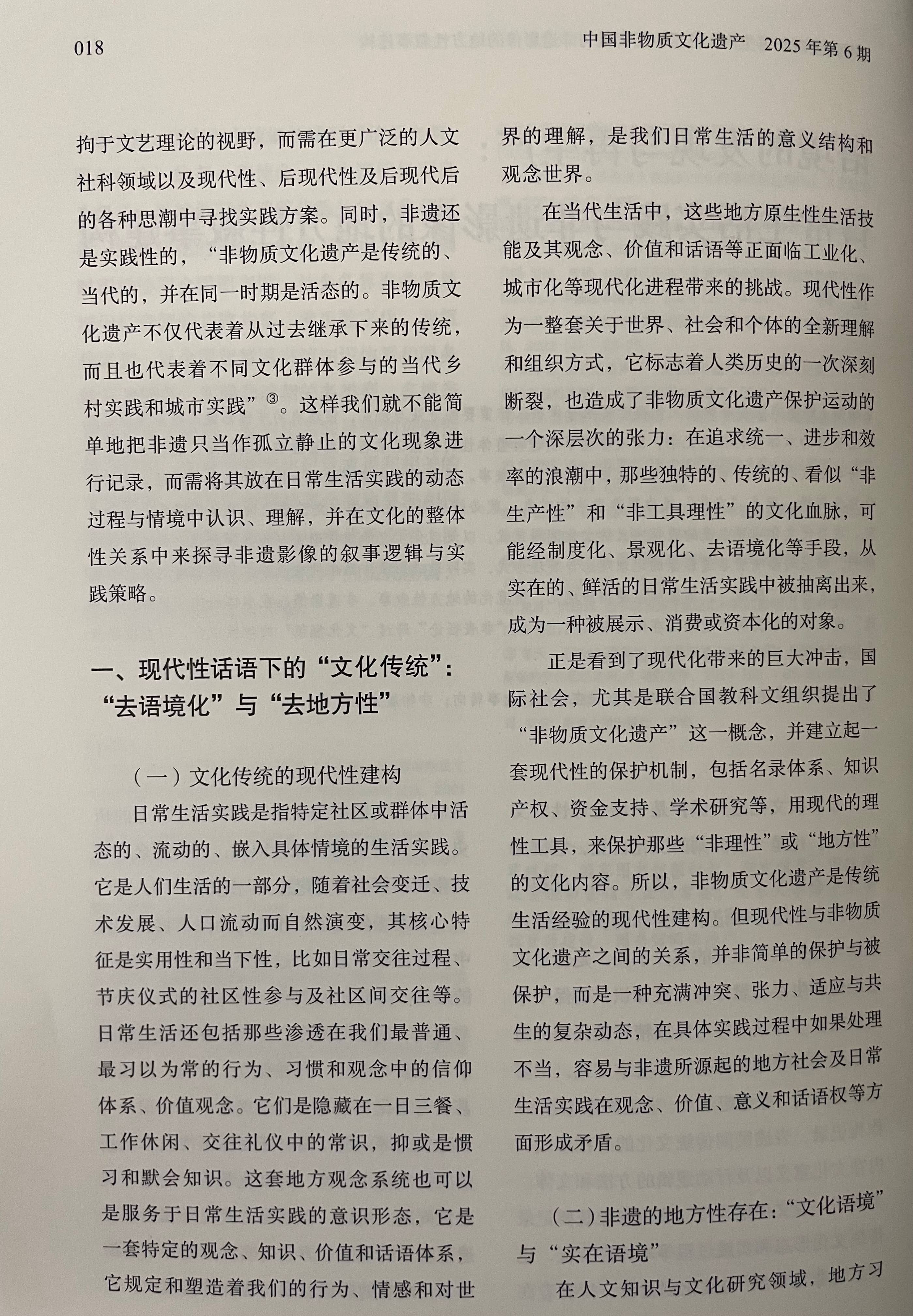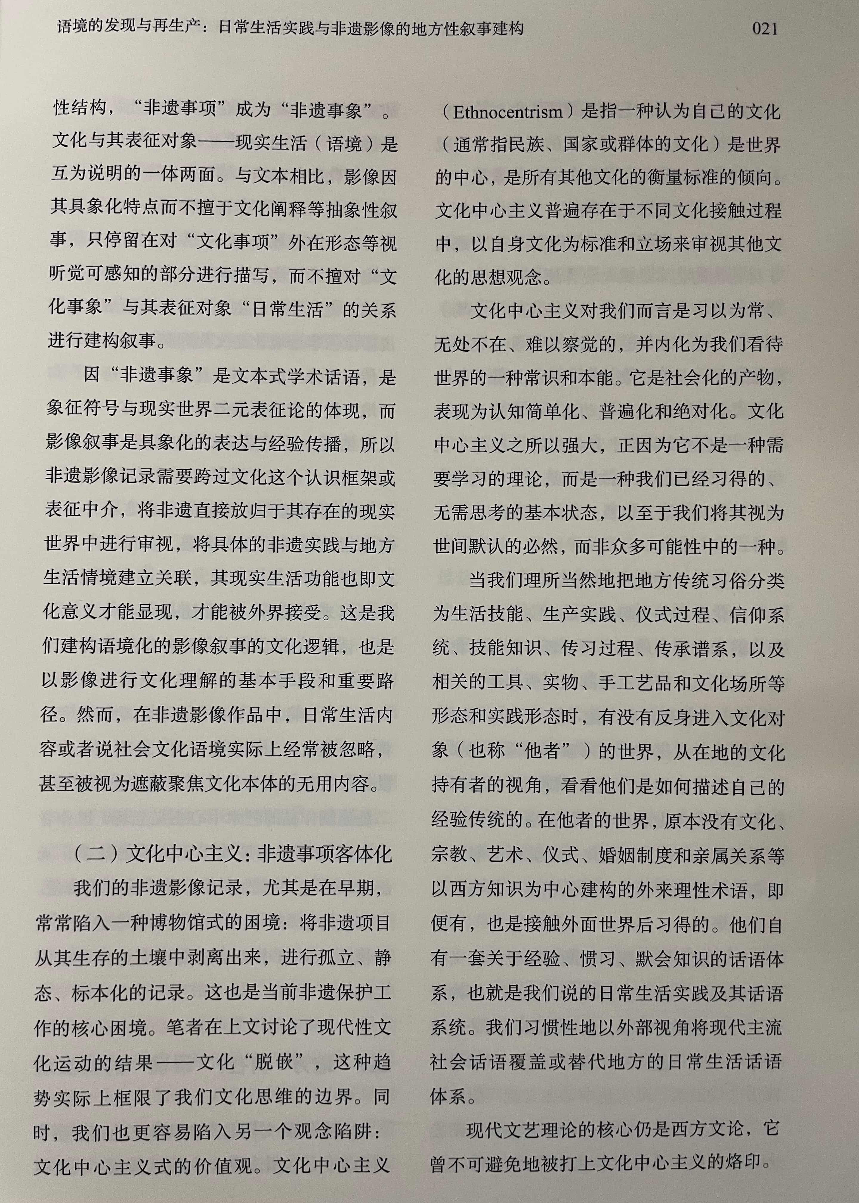 文章提出:影像方法是非物质文化遗产记录与保护工作重要的方法与形式,但现有的非遗影像实践多停留在对非遗项目的本体性特征的记录,而对非遗事项进行整体性的影像记录表达则面临较大的困难,表现为影像难以将非遗放归于持有者的社会文化生活过程中进行叙事。非物质文化遗产被视为传统习俗在现代社会中的文化角色转换,而当“文化”成为影像表达的对象,就必然受到文化理论与文艺理论两种知识理性力量的支配。现当代文化研究主流的表征主义的文化阐释范式,以及现代主义的文艺理论与审美现代性对日常生活的批判,都深刻影响着非遗影像的记录观念与表现形式,实际造成影像作品中的非遗事象从持有者的文化传统与社会生活中“脱嵌”,影像难以建构语境化、情境化的地方性叙事。非遗影像应在本体论的“日常生活实践”视域中重新发现非遗的实在的叙事语境,即以“非表征论”跨过“文化框架”的理性中介,以直接经验路径来实现非物质文化遗产的整体性叙事。