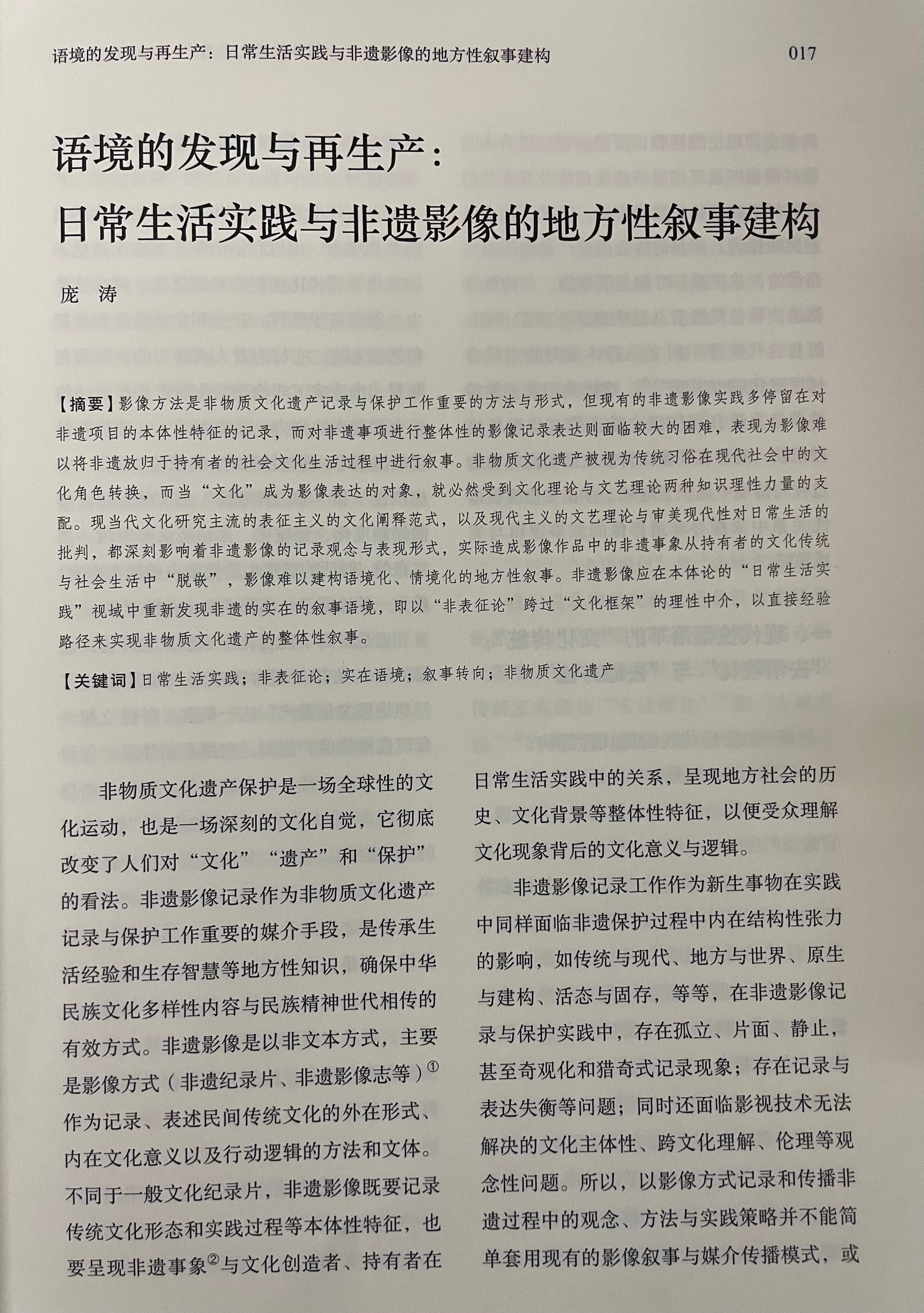 近日,我校视听传媒学院庞涛老师撰写的论文《语境的发现与再生产:日常生活实践与非遗影像的地方性叙事建构》在AMI核心期刊《中国非物质文化遗产》正式发表。