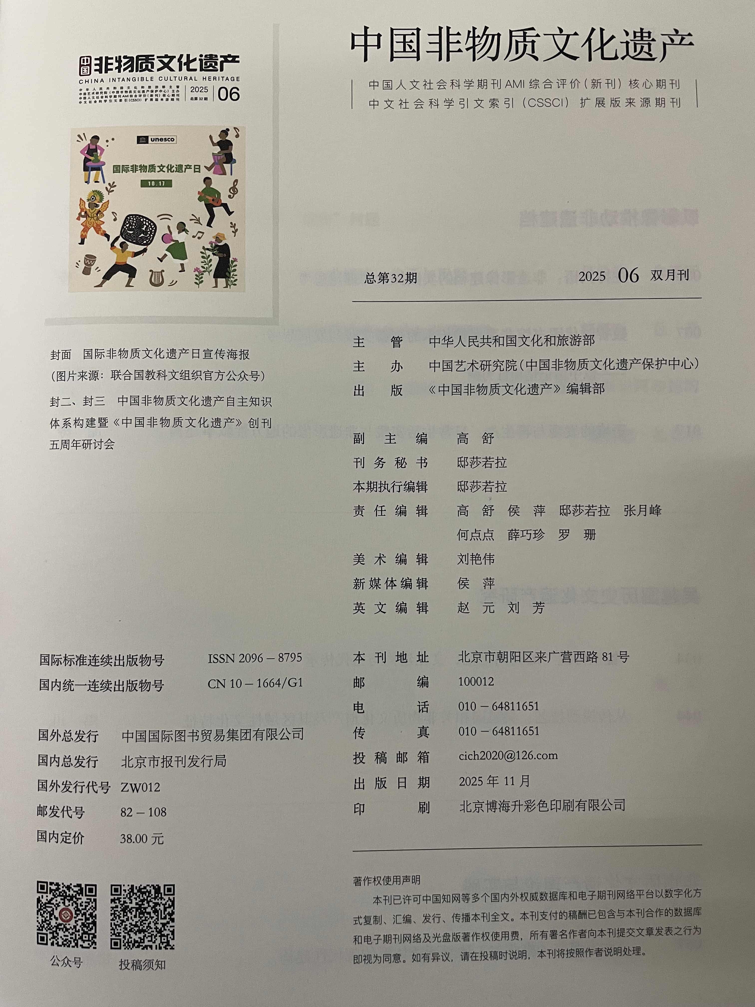 《中国非物质文化遗产》是由中华人民共和国文化和旅游部主管、中国艺术研究院(中国非物质文化遗产保护中心)主办的专业性学术期刊,创刊于2020年,双月刊出版。该刊聚焦中外非物质文化遗产领域,涵盖政策解读、研究理论、田野个案、著述评介、专题访谈等内容,常设“文化遗产研究”“保护理论与实践”“文化传播与文明互鉴”“传承者”等栏目,细分“口头传统”“传统表演艺术”“传统手工艺”等板块。期刊被列为中国人文社会科学期刊AMI新刊核心期刊(2022年)、CSSCI扩展版来源期刊,并获国家哲学社会科学文献中心“2022—2024年度最受欢迎新刊”称号。截至2025年5月,累计出版文献531篇,总下载量超18万次,总被引1786次,2024版复合影响因子为1.097。该刊立足非遗保护实践,致力于构建学术交流平台,推动中国非遗自主知识体系建构,服务学科发展。