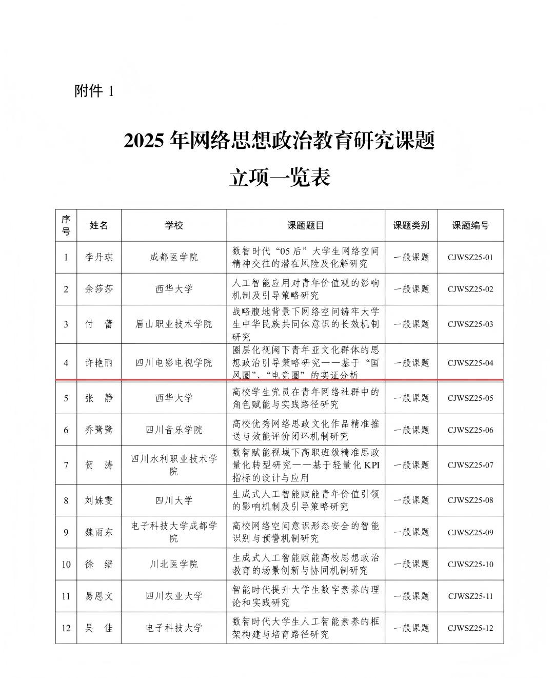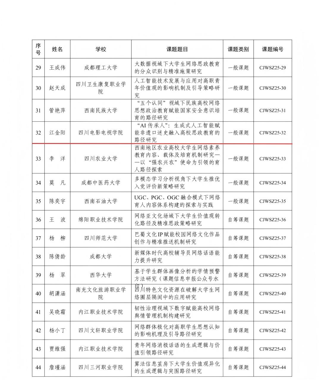 近日,从四川省教育厅获悉,我校设计与美术学院江金阳老师、马克思主义学院许艳丽老师分别主持申报的《“AI传承人”:生成式人工智能赋能非遗口述史融入高校思政教育的路径研究》、《圈层化视阈下青年亚文化群体的思想政治引导策略研究——基于“国风圈”、“电竞圈”的实证分析》获得立项,请课题组成员按照四川民族民俗文化研究中心管理办法做好课题后续研究。