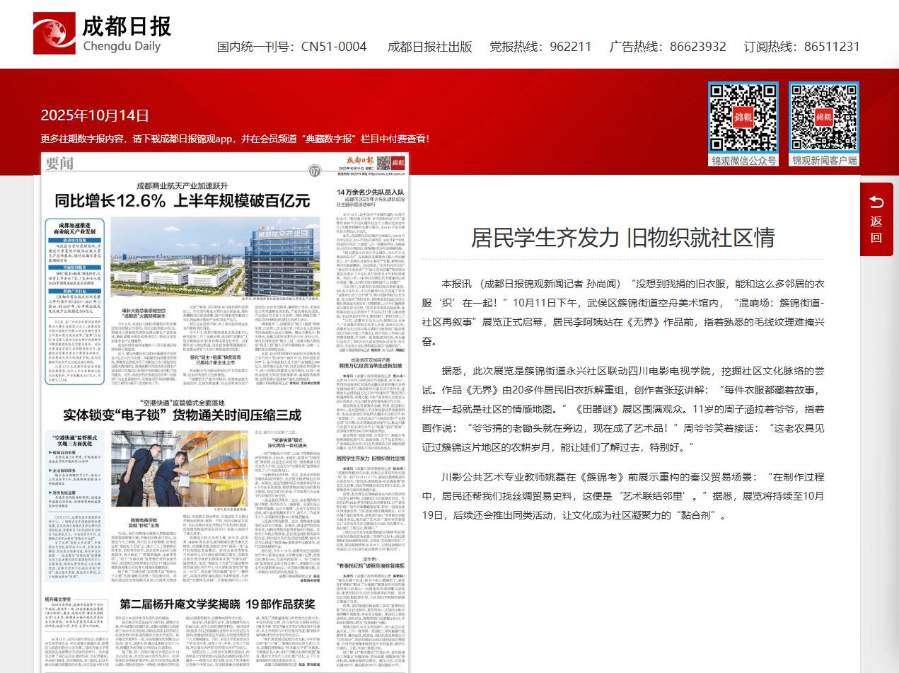 近日,由四川电影电视学院主办,我校设计与美术学院公共艺术专业姚磊老师策划并指导,7位应届毕业生与武侯区簇锦街道居民共同参与的“混响场:簇锦街道—社区再叙事”展览,被《成都日报》关注报道。