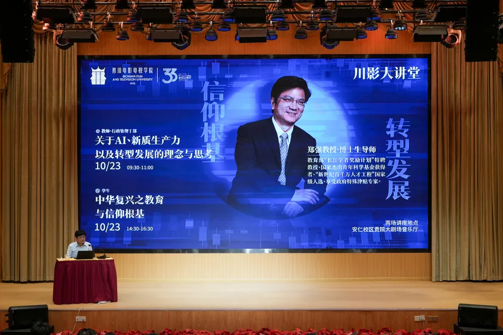 在随后的两场专题报告中,郑强教授以广阔的学术视野和深沉的教育情怀,分别围绕“关于AI、新质生产力以及转型发展的理念与思考”、“中华复兴之教育与信仰根基”两大主题,与川影师生进行了分享,现场反响热烈,启迪深远。